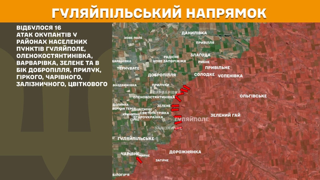 На Гуляйпільському напрямку сталося 16 російських атак у районах Гуляйполя, Оленокостянтинівки, Варварівки, Зеленого та в бік Добропілля, Прилук, Гіркого, Чарівного, Залізничного і Цвіткового.
