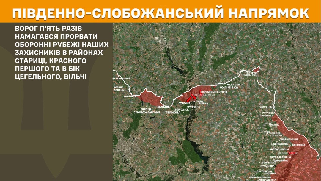 На Південно-Слобожанському напрямку ворог п’ять разів намагався прорвати оборонні рубежі у районах Стариці, Красного Першого та в бік Цегельного і Вільчі.