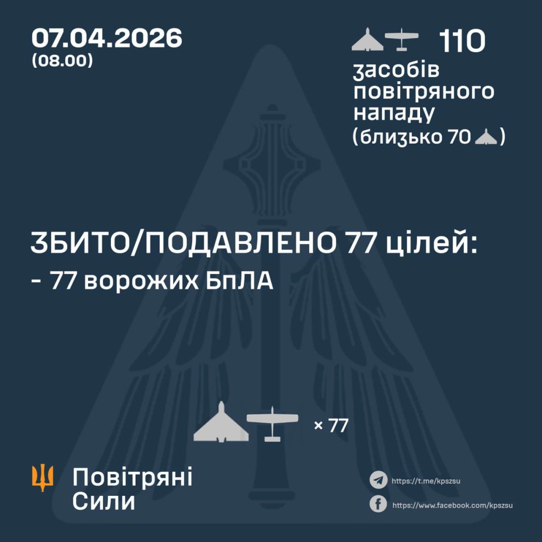 За попередніми даними, станом на 08:00 вівторка, 7 квітня, ППО збила / подавила 77 дронів на півночі, півдні та сході України.