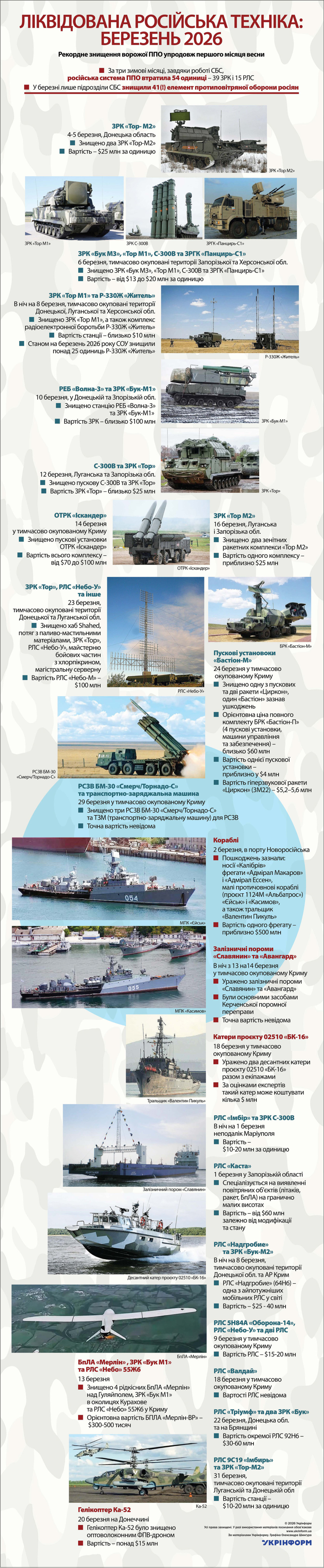 Підсумки геноциду ворожої ППО в березні – приголомшливі! Одні лише підрозділи СБС змусили назавжди вийти із чата 41(!) елемент протиповітряної оборони росіян. А це вже не про «втрати», а однозначно – про руйнування системності у структурі хваленого російського повітряного захисту.