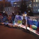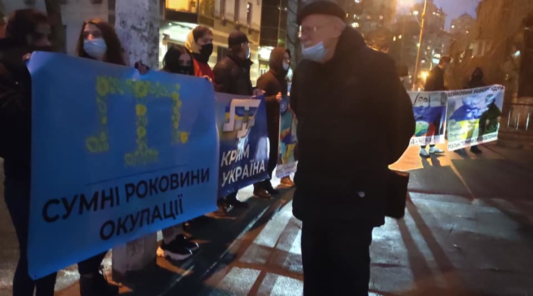 Учасники заходу тримають банери з написами "Крим - невід'ємна частина України", "Крим - це Україна", "Сумні роковини окупації" та інші.