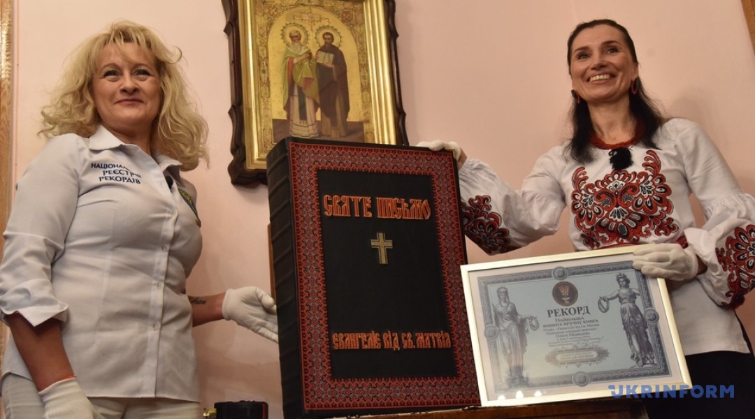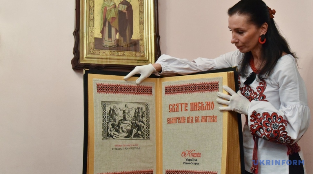 Як повідомляло агентство, член Національної спілки письменників України, майстер народної творчості Олена Медведєва з Рівного вишила повні тексти «Євангелія від Івана», «Євангелія від Марка», «Євангелія від Луки», «Євангелія від Матвія», розмір сторінок яких 60х42 см. Кожна книга має палітурки, обтягнуті шкірою і зберігаються у спеціальному дерев’яному футлярі, оздобленому художньою різьбою.
