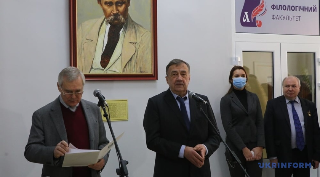 "Ми зібрали у нашій галереї - до речі, перший такій серед вишів країни, - портрети 16-х вихованців університету, які тут навчалися чи працювали та написали твори, які збагачують історичну пам’ять народу, його національну самобутність й ідентичність. Галерею невипадково відкриває портрет письменника Олеся Гончара, ім'я якого є серед ініціаторів цієї премії, і який свого часу отримав цю нагороду серед перших трьох лауреатів у країні. Він, студент філфаку, у 41-му році пішов на фронт у числі студентів-добробатівців університету, пам'ятник яким встановлено біля будівлі вишу. Галерея - не єдина данина пам'яті вихованцям вишу. На ім'я багатьох із них в університеті названо аудиторії, наукові центри та лабораторії", - зазначив на відкритті галереї ректор, академік НАНУ Віль Бакіров.
