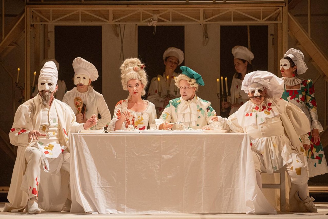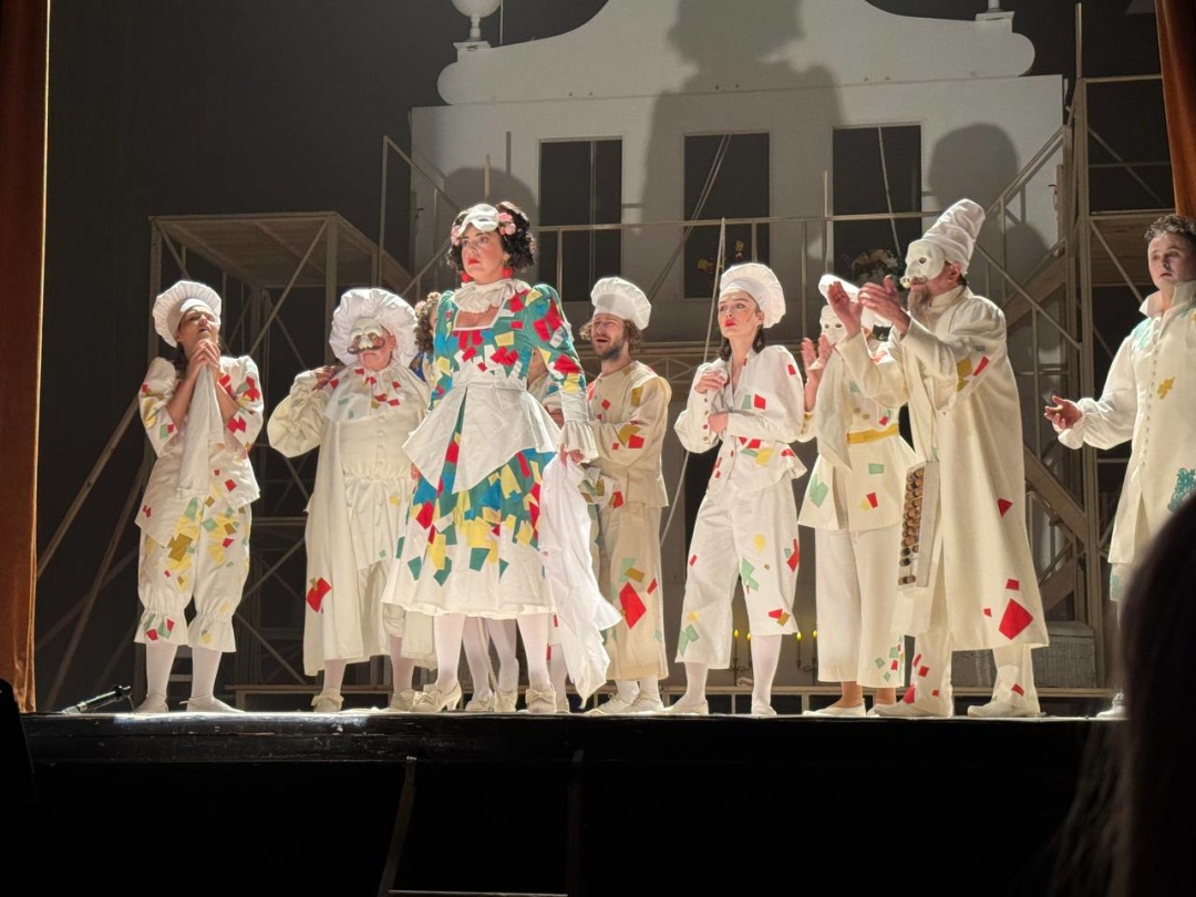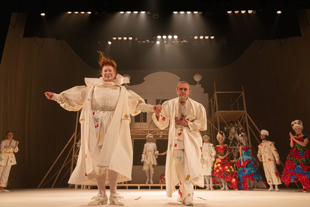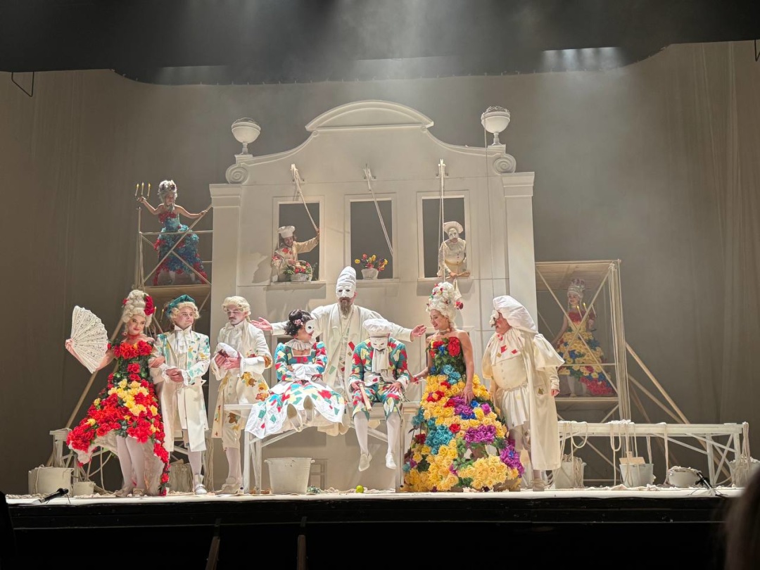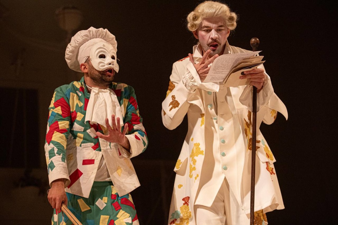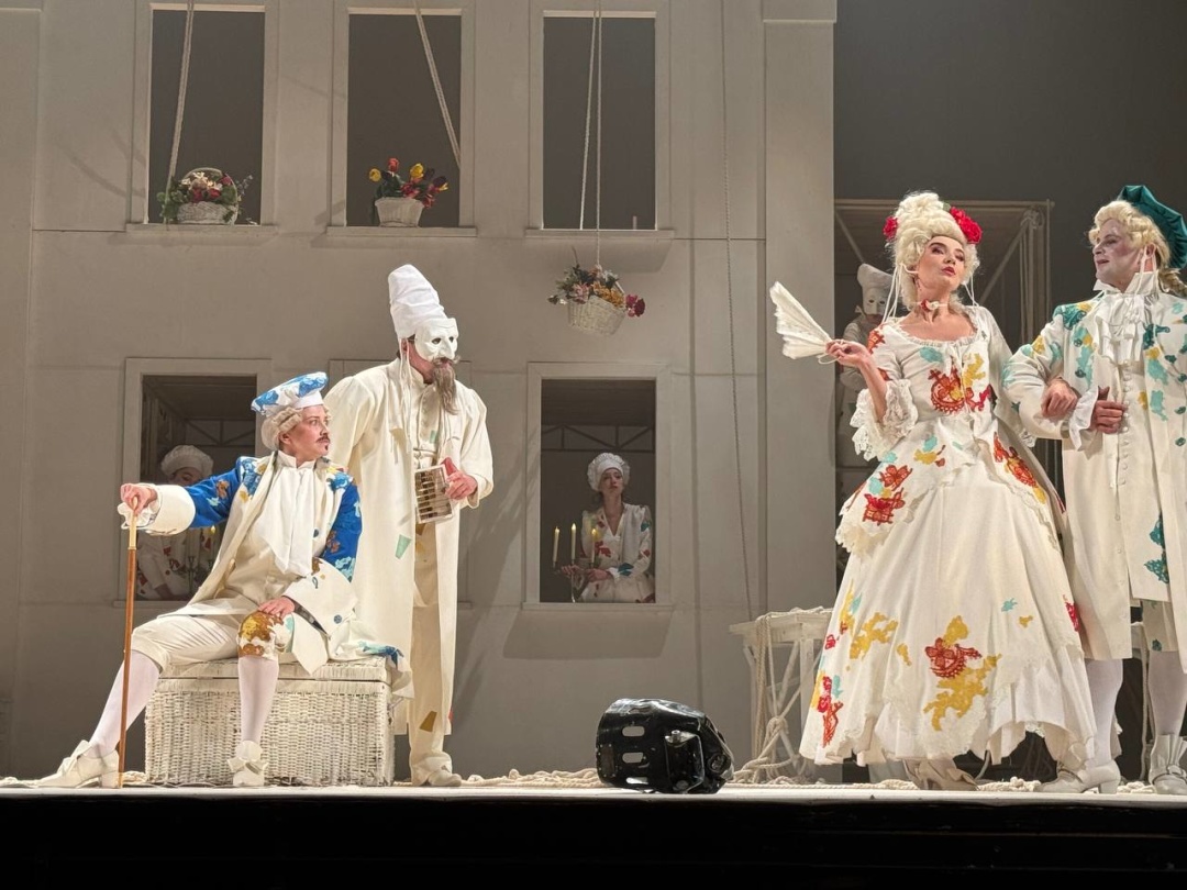 Однак, якщо костюми та сценографія – це все ж авторські варіації на венеційську тему, то маски на акторах цілком традиційні для комедії дель арте, тільки вписані в загальну світлу палітру – вони білі, кольору цукрової меренги.
