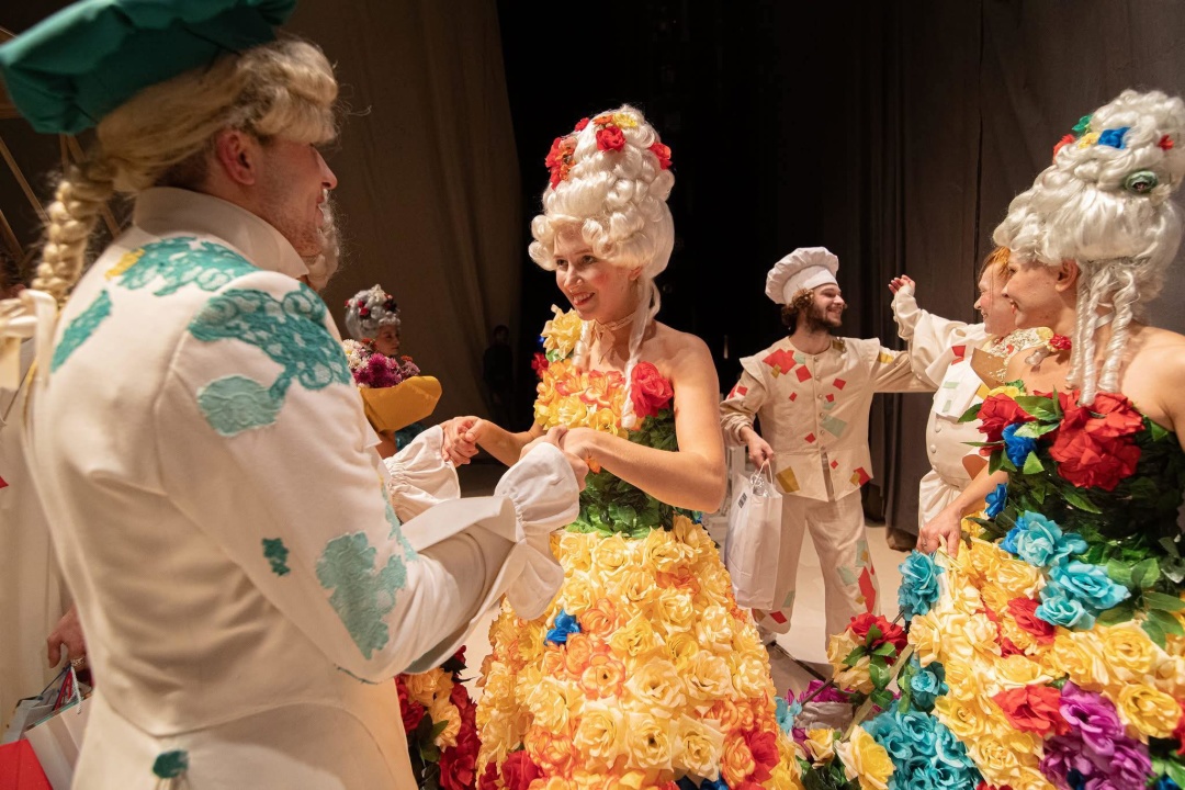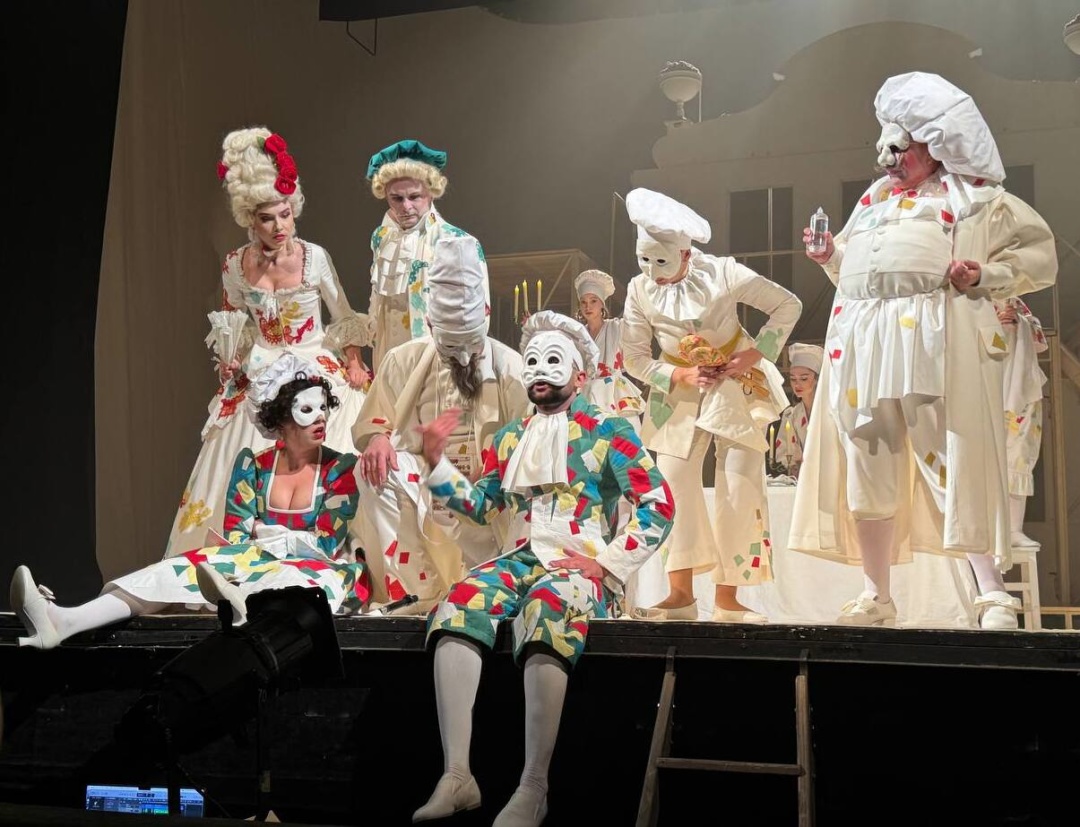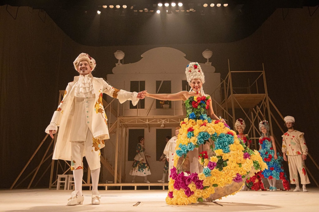Як тільки-но відкриваються лаштунки, нас заворожує масштабна сценографія у вершкових тонах, створена художницею Даниїлою Колот: схематично-вишуканий венеційський будинок-готель епохи Відродження обертається навколо себе, а з вазонів на його вікнах пишні та барвисті визирають квіти, які в кінці дійства рясно розквітнуть на сукнях деяких персонажів. Кухарські ковпаки, тістечка, піца, оперний спів та італійська тарантела – режисер смачно обіграв сповнену веселих мелодій комедію навколо італійської кухні.