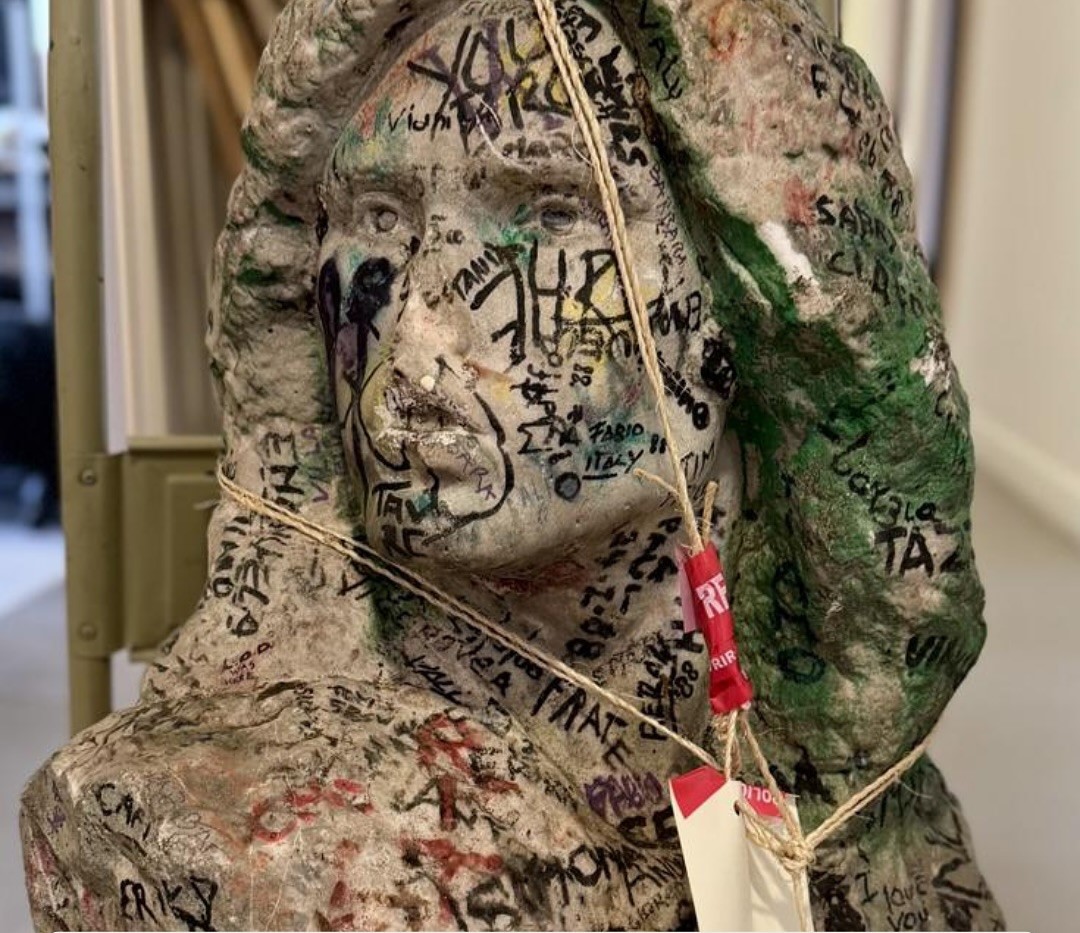 Судячи з опублікованої правоохоронцями фотографії, у скульптури зламаний ніс, вона рясно вкрита написами.