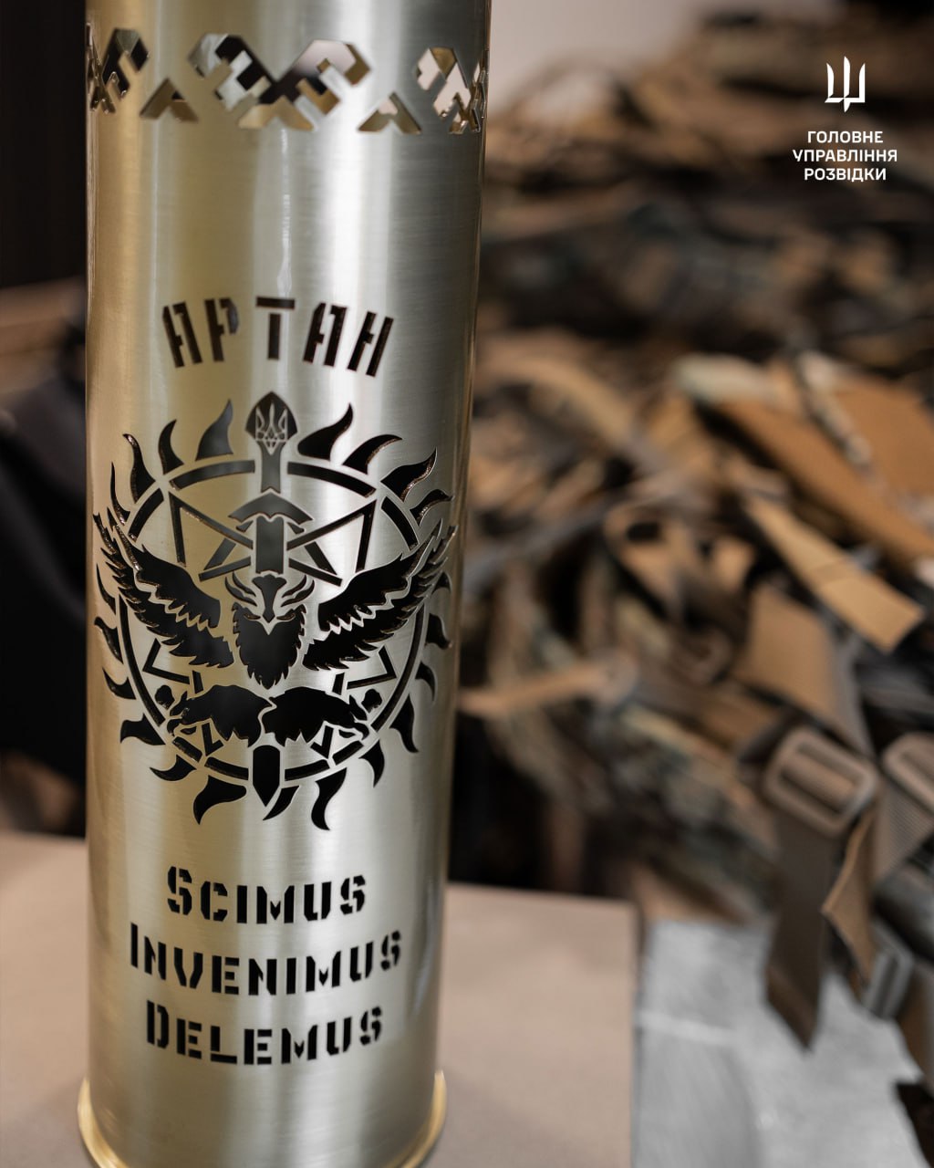"Хочемо від бійців «Артану» передати для вас пам'ятний подарунок. Ви можете його розіграти на аукціоні або залишити собі на згадку. Напис на гільзі — це девіз підрозділу, який перекладається з латини як «Знаємо. Знаходимо. Знищуємо»", - підкреслила вона.