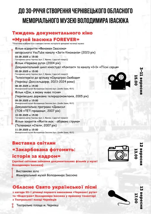 "Тиждень документального кіно та Свято української пісні на Театральній площі Чернівців: до 30-річчя Чернівецького обласного меморіального музею Володимира Івасюка буковинців та гостей області запрошують на тематичні заходи". - йдеться у повідомленні.