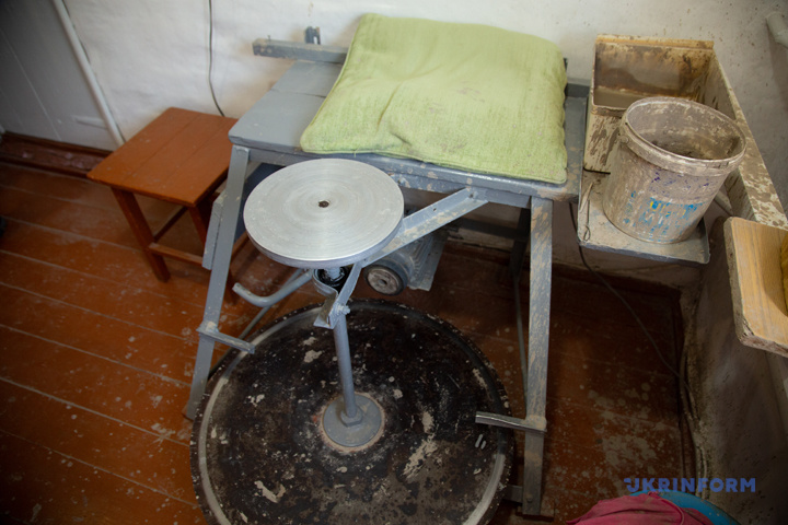 Такий гончарний круг майстри робили самі. У продажу є сучасне обладнання, але воно зазвичай призначене, щоб розміщувати на столі й працювати лиш руками. Тут же гончар ще й ногою крутить механізм.