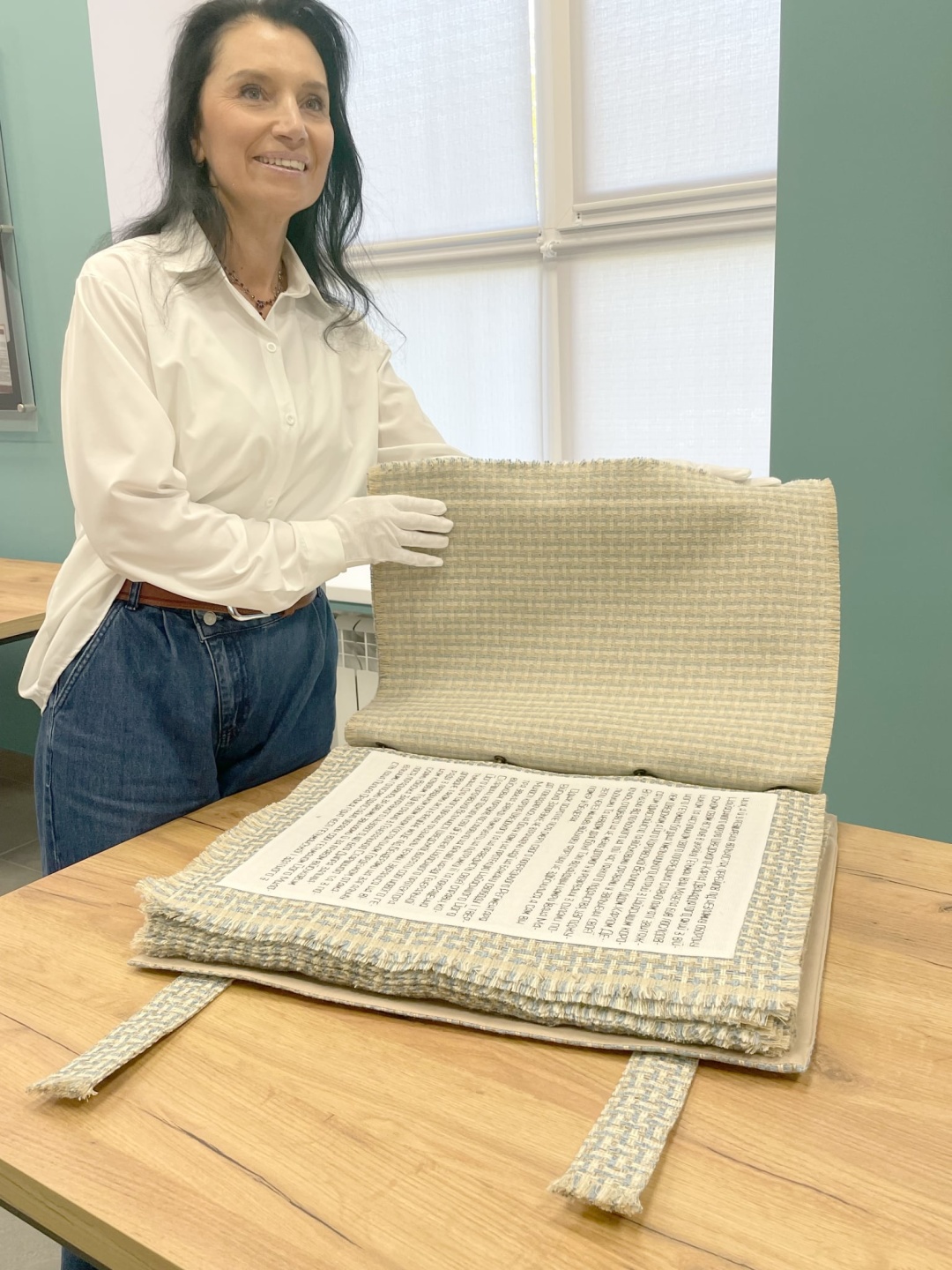 «Текст я розмістила на двадцяти сторінках із білого полотна розміром 48х35 сантиметрів, які склали книгу. Букви вишиті чорною ниткою DMC французького виробництва: їх товщина ‒ 1 міліметр, висота ‒ 1 сантиметр, ширина ‒ 0,5 сантиметра», ‒ сказала Медведєва.