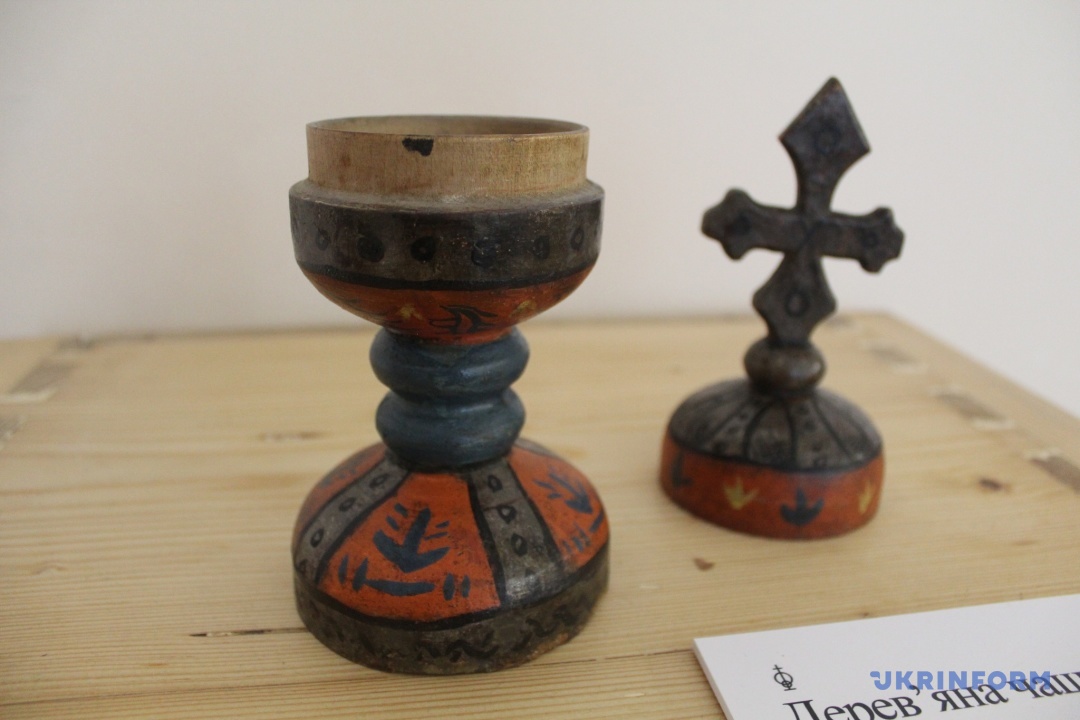 Йдемо оглядати експозицію. Оксана Маричевська, яка проводить тут екскурсії щодня, показує дерев’яну дарохранильницю із чашею, розповідає про різьблені хрести – старовинні та сучасні.