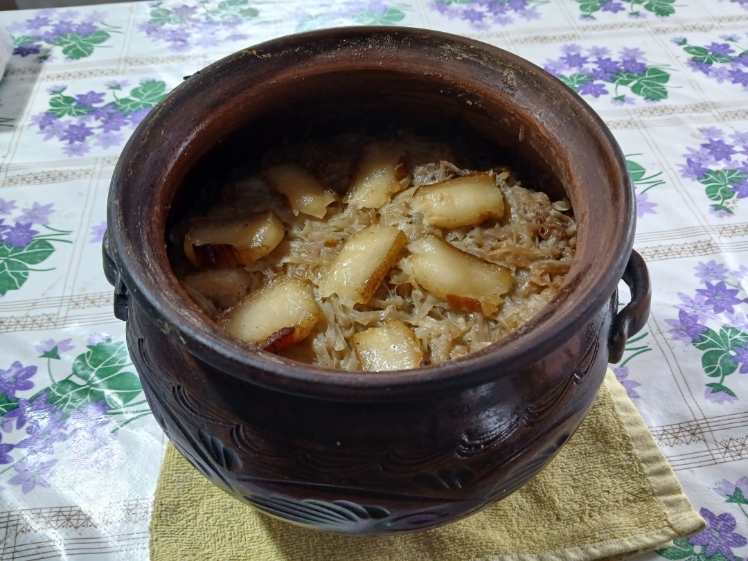 У глиняний горщик кидають картоплю, м’ясо, квасолю, сушені гриби, додають сєчанку разом із сиропом, засмажку зі сала та цибулі, сіль і доливають воду.