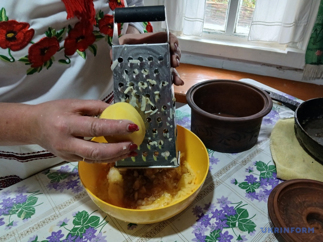 Світлана Левківська починає натирати картоплю на великій тертці. Раніше її терли на дрібній, але тепер, як жартують, на це не вистачає часу. Сучасний метод приготування страви швидший і додає їй більш вираженого смаку.