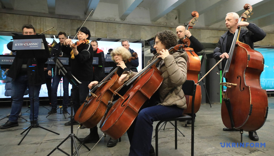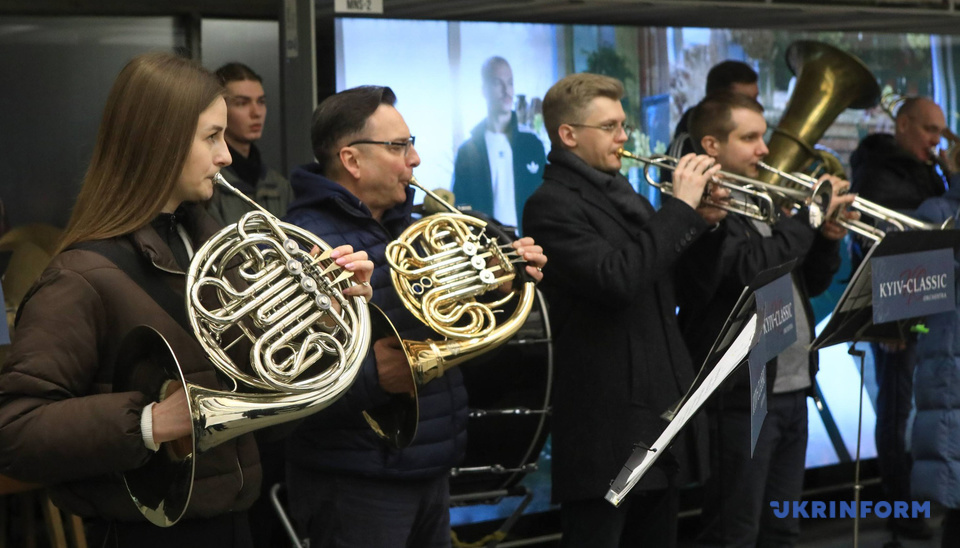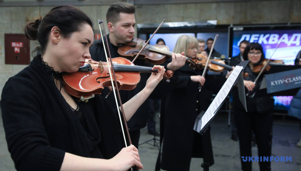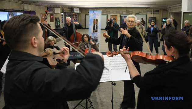 Як повідомляє кореспондент Укрінформу, акцію провів камерний оркестр «Київ Класик» у вестибюлі станції метро «Майдан Незалежності».