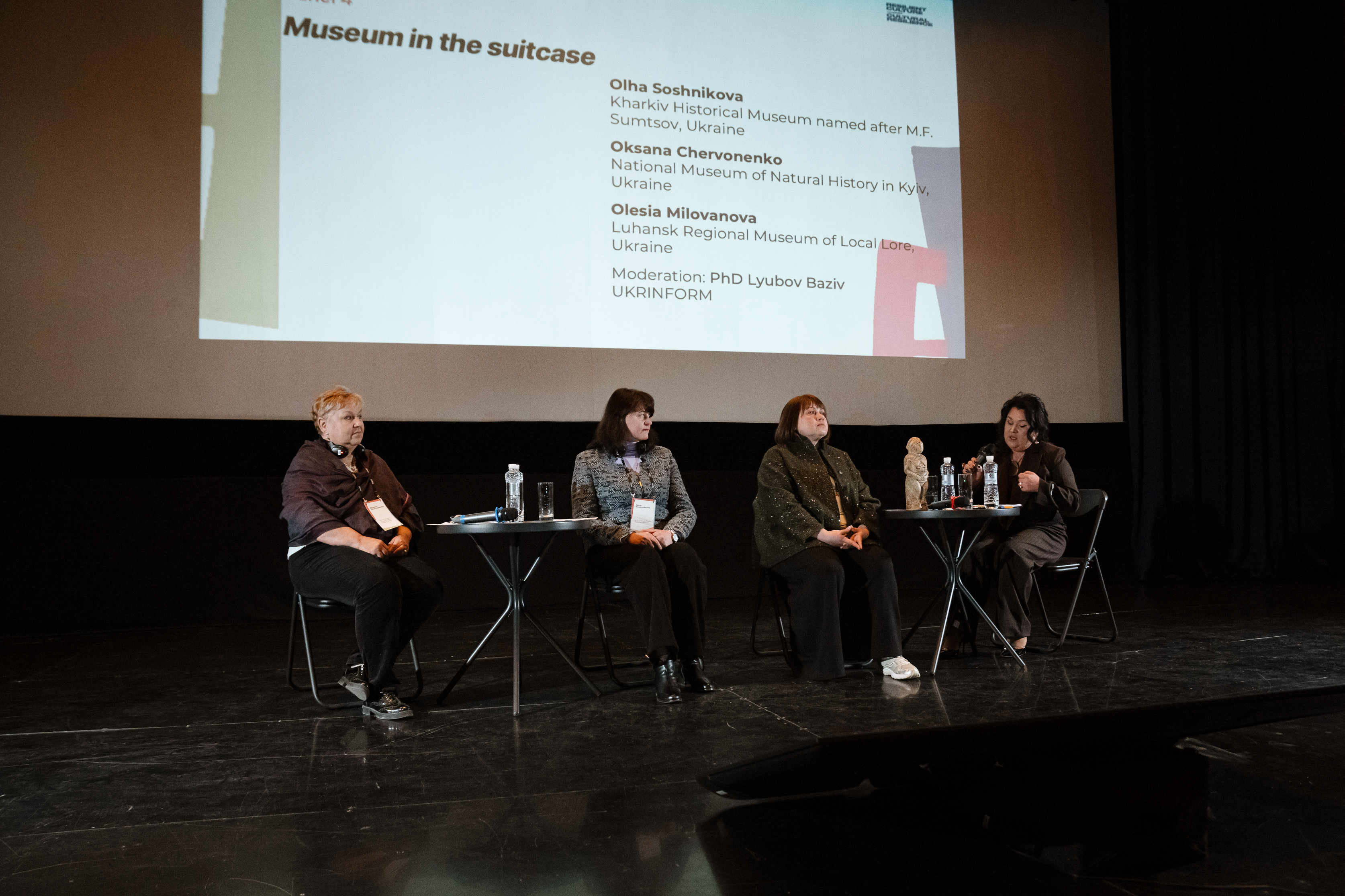 Назва панелі – «Музей у валізі». І це не метафора заради красивого звучання. Адже для багатьох українських музеїв це стало реальністю. Учасниці дискусії – керівниці музеїв, які прожили цей досвід дуже по-різному, але кожна з них знає, що означає зберігати культуру в умовах загрози її знищення: Ольга Сошнікова – директорка Харківського історичного музею імені Миколи Сумцова, Оксана Червоненко – заступниця директора з наукової та музейної роботи Національного науково-природничого музею, Олеся Мілованова – директорка Луганського обласного краєзнавчого музею.