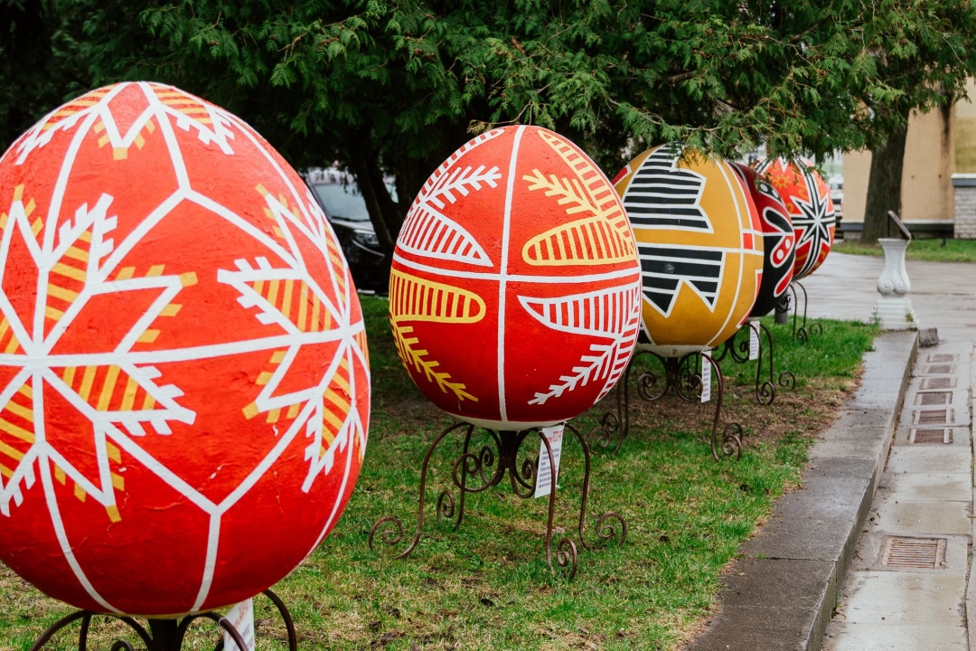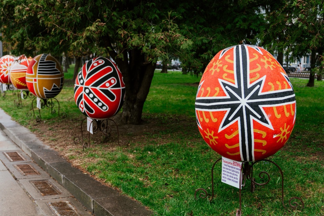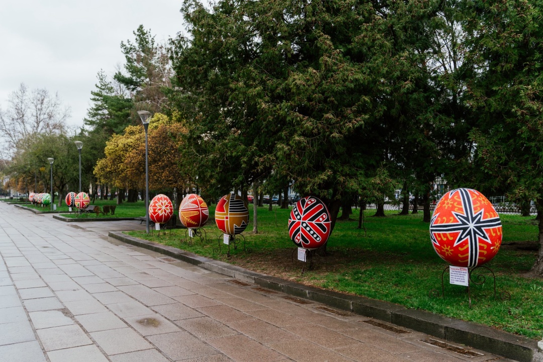 У Рівному поблизу алеї імені Чайки встановили майже пів сотні великодніх писанок, розмальованих за мотивами народної художниці Марії Примаченко.