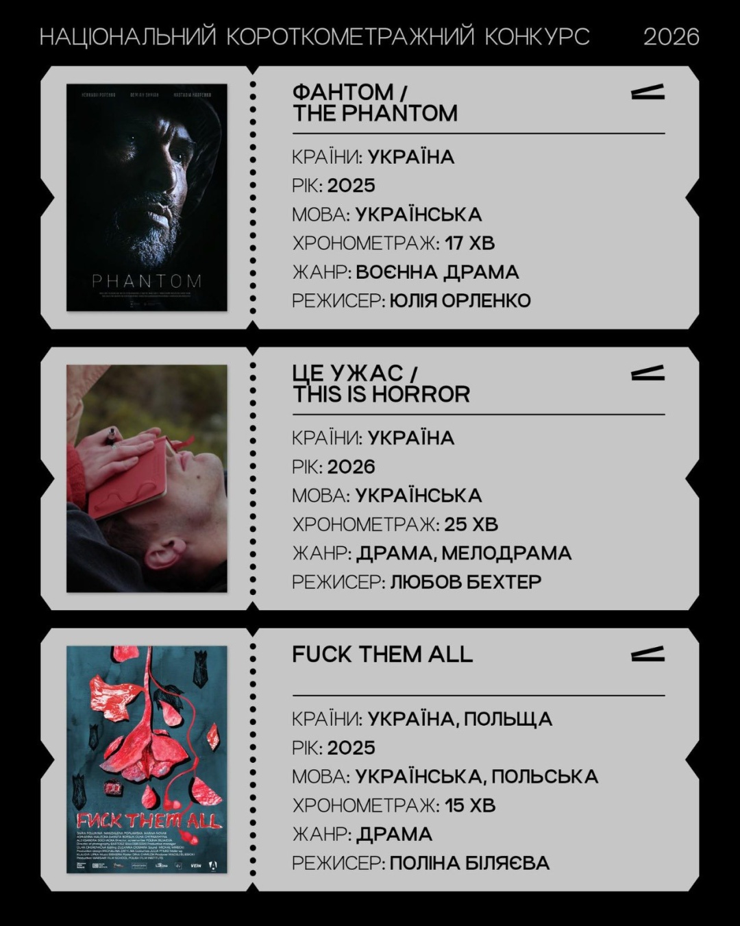 - "Це ужас", режисерка Любов Бехтер (Україна, 25 хв., 2026);