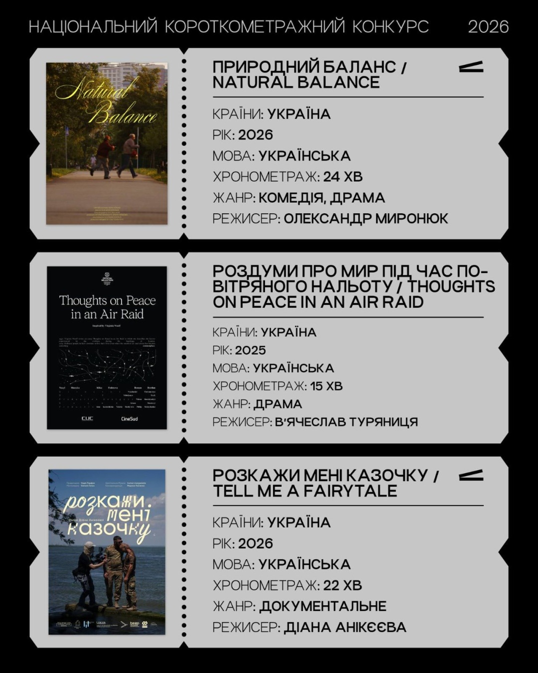 - "Природний баланс", режисер Олександр Миронюк (Україна, 24 хв., 2026);