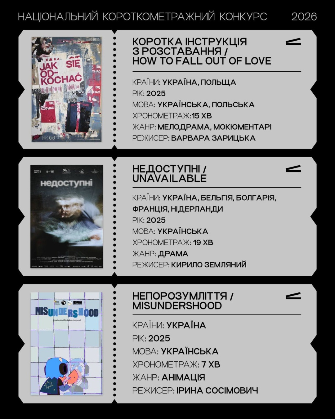 - "Коротка інструкція з розставання", режисерка Варвара Зарицька (Україна, Польща, 15 хв., 2025);