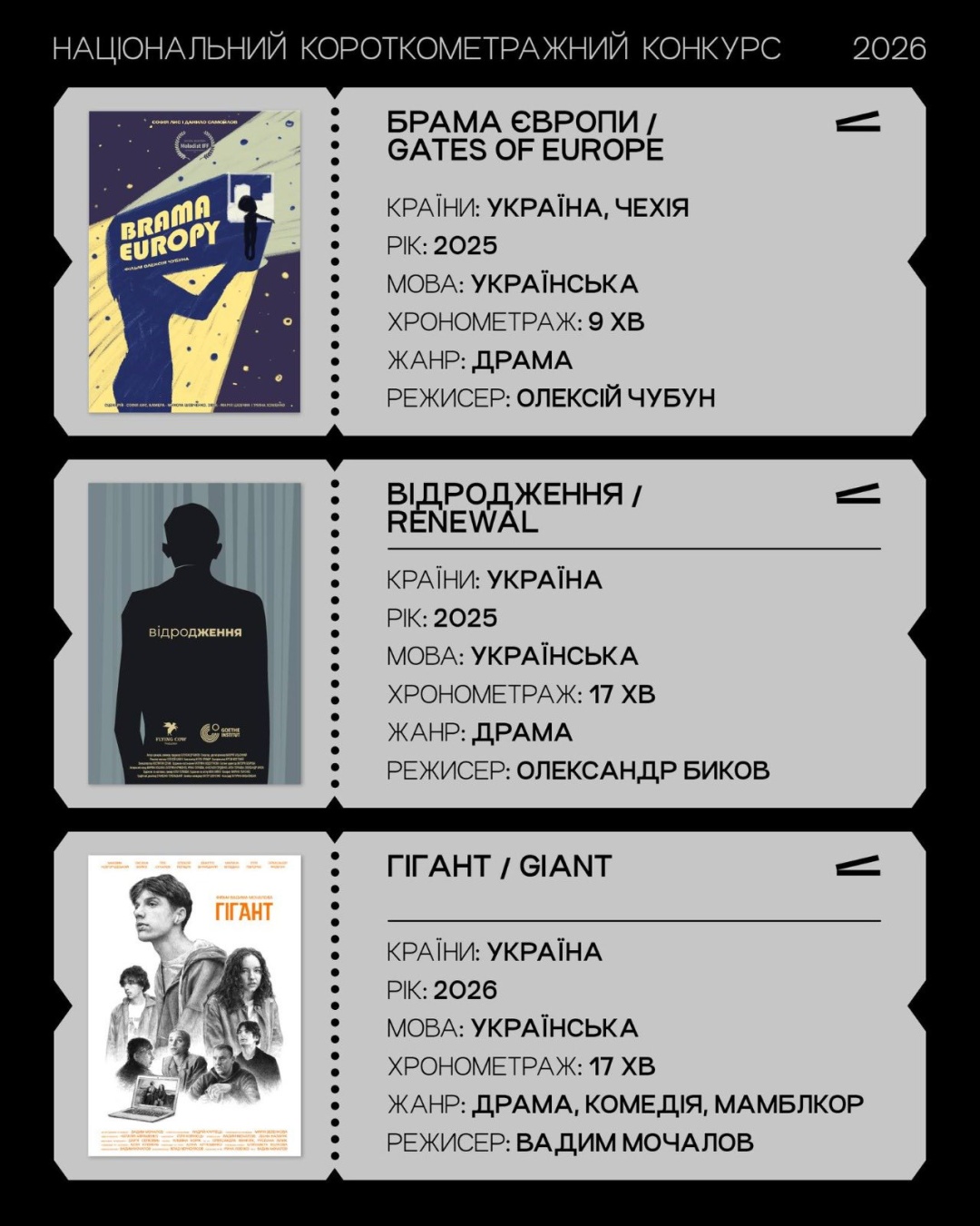 - "Гігант", режисер Вадим Мочалов (Україна, 17 хв., 2026);