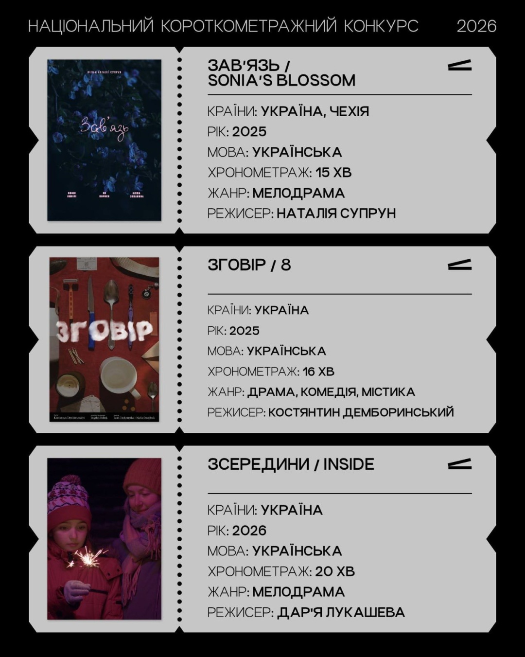 - "Зговір", режисер Костянтин Демборинський (Україна, 16 хв., 2025);