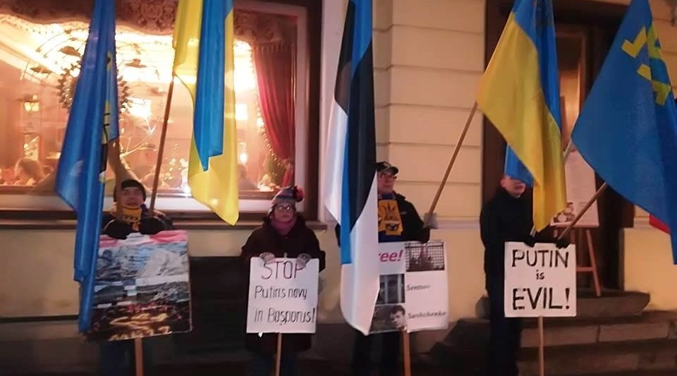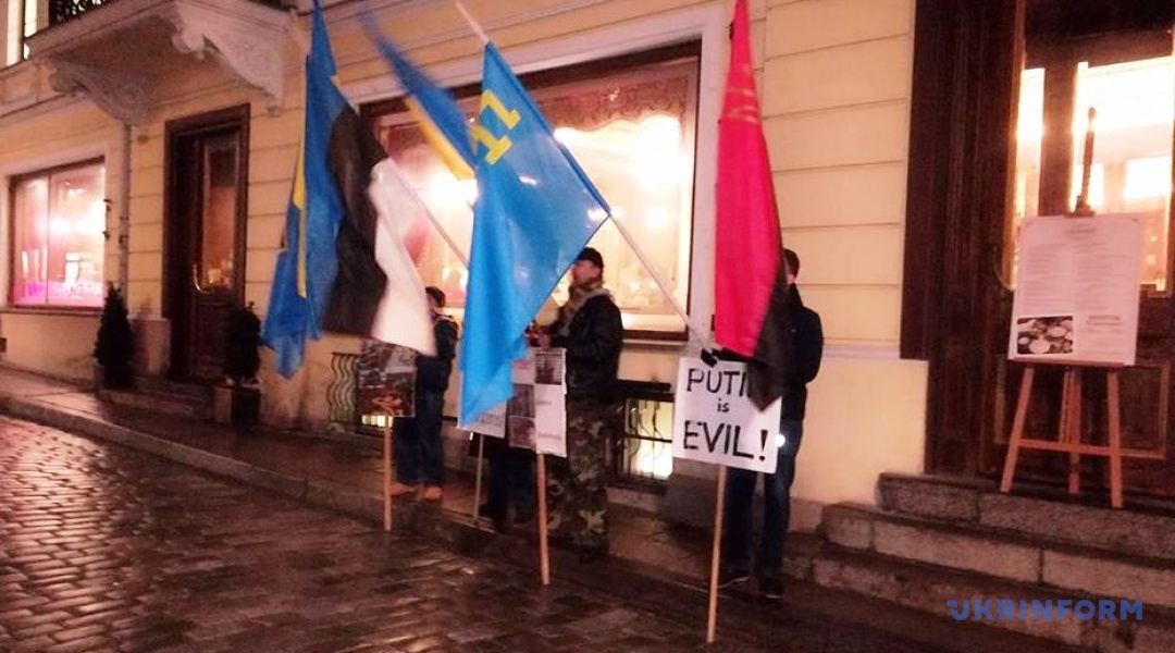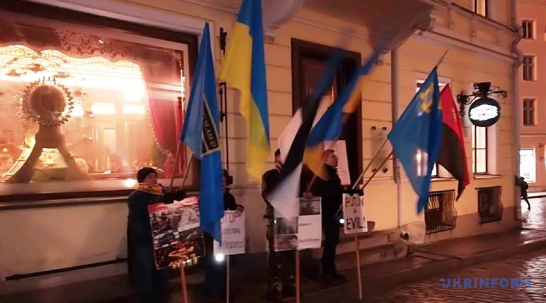 Пікет під естонськими та українськими прапорами проходив у четвер у центрі старого міста навпроти посольства Росії в Таллінні в робочий час.