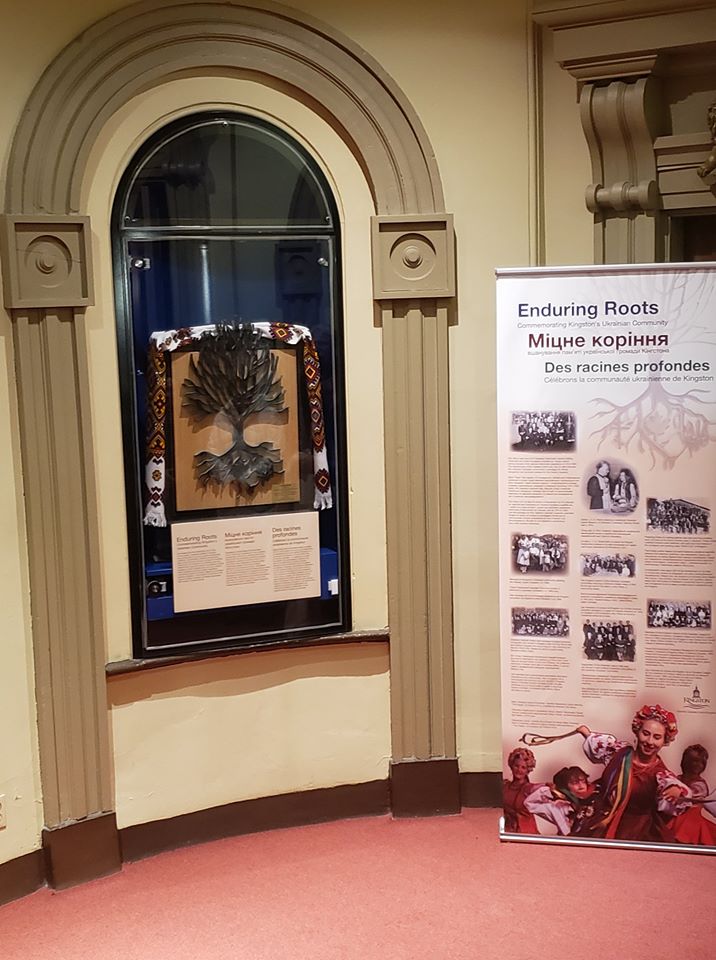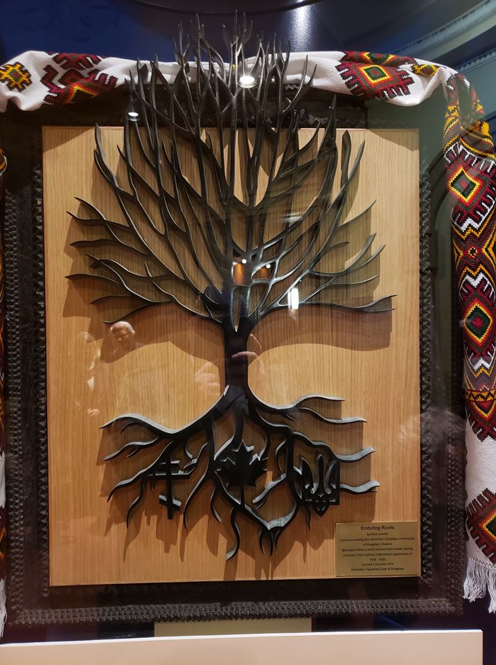"Cкульптура "Міцне коріння", присвячена українській громаді міста Кінгстон, відтепер - у приміщенні мерії міста. У підніжжя скульптури авторства Ніка Ленюка тризуб, хрест та кленовий лист, які символізують вклад українців Кінгстона у культурну та історичну спадщину Канади", - йдеться у повідомленні.
