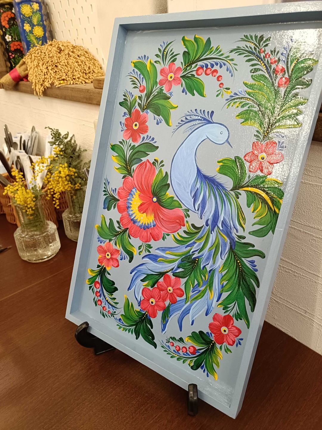 Окрім виставки, у кафе також можна придбати українські сувеніри з петриківським розписом від пані Алли та скуштувати українські страви.