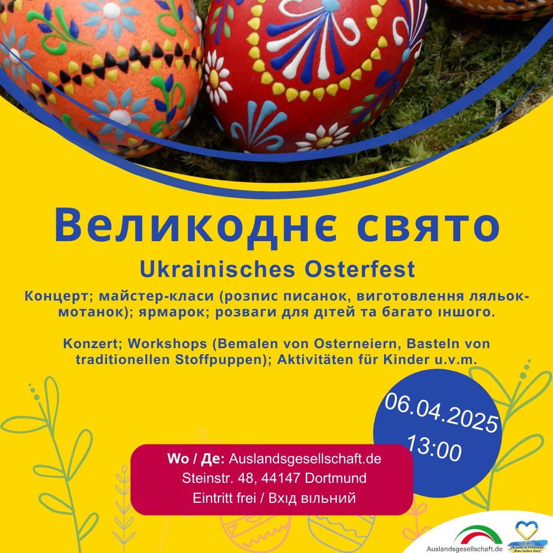 Великоднє свято розпочнеться в неділю о 13.00 в Auslandsgesellschaft за адресою: Steinstr. 48, 44147 Dortmund.