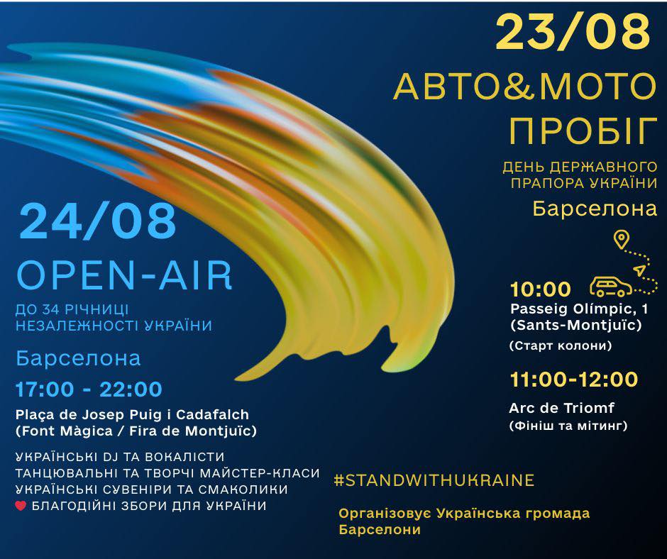 24 серпня, у День Незалежності, українців та гостей міста запрошують на великий open-air на Plaça de Josep Puig i Cadafalch (Font Màgica / Fira de Montjuïc). З 17:00 до 22:00 на відвідувачів чекають виступи українських музикантів, ді-джеїв та вокалістів, танцювальні та творчі майстер-класи. Гості також матимуть можливість придбати українські сувеніри та смаколики, а також долучитися до благодійного збору на підтримку полонених.