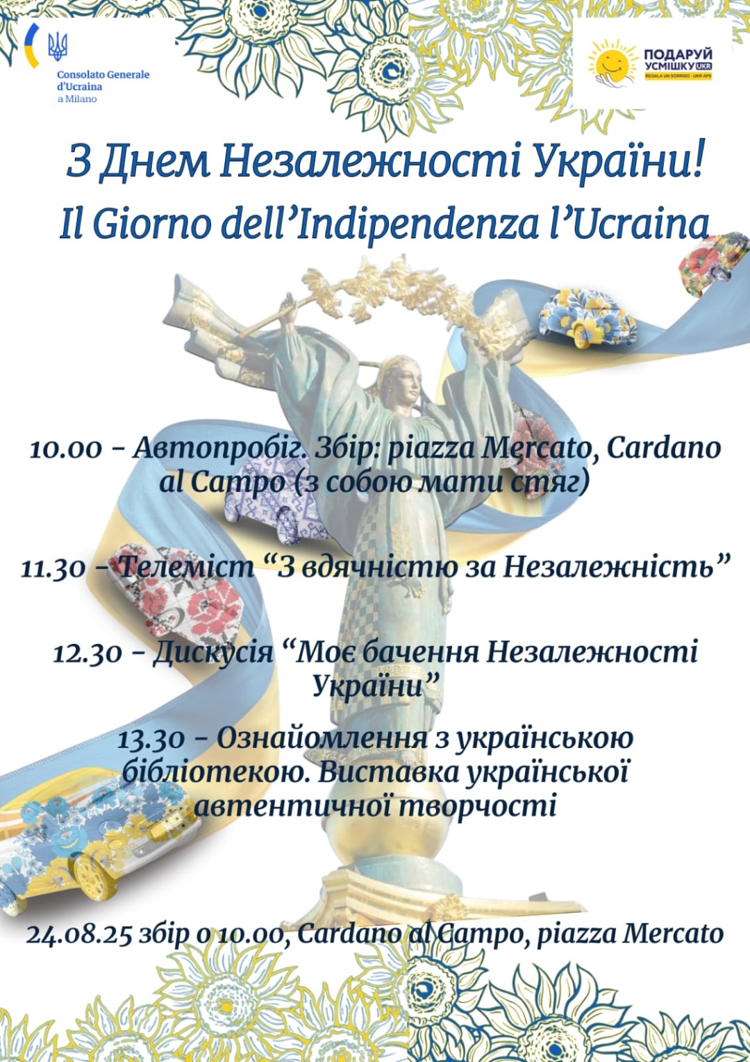 Асоціація Regala un sorriso-UKR APS запрошує громаду та друзів України долучитися до святкування Дня Незалежності, яке відбудеться 24 серпня у Кардано-аль-Кампо та Галлрате.