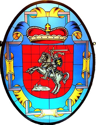 Вітраж зображує Витязя – історичний герб Великого князівства Литовського, виконаний у стилі іконографії XVII–XVIII століть.