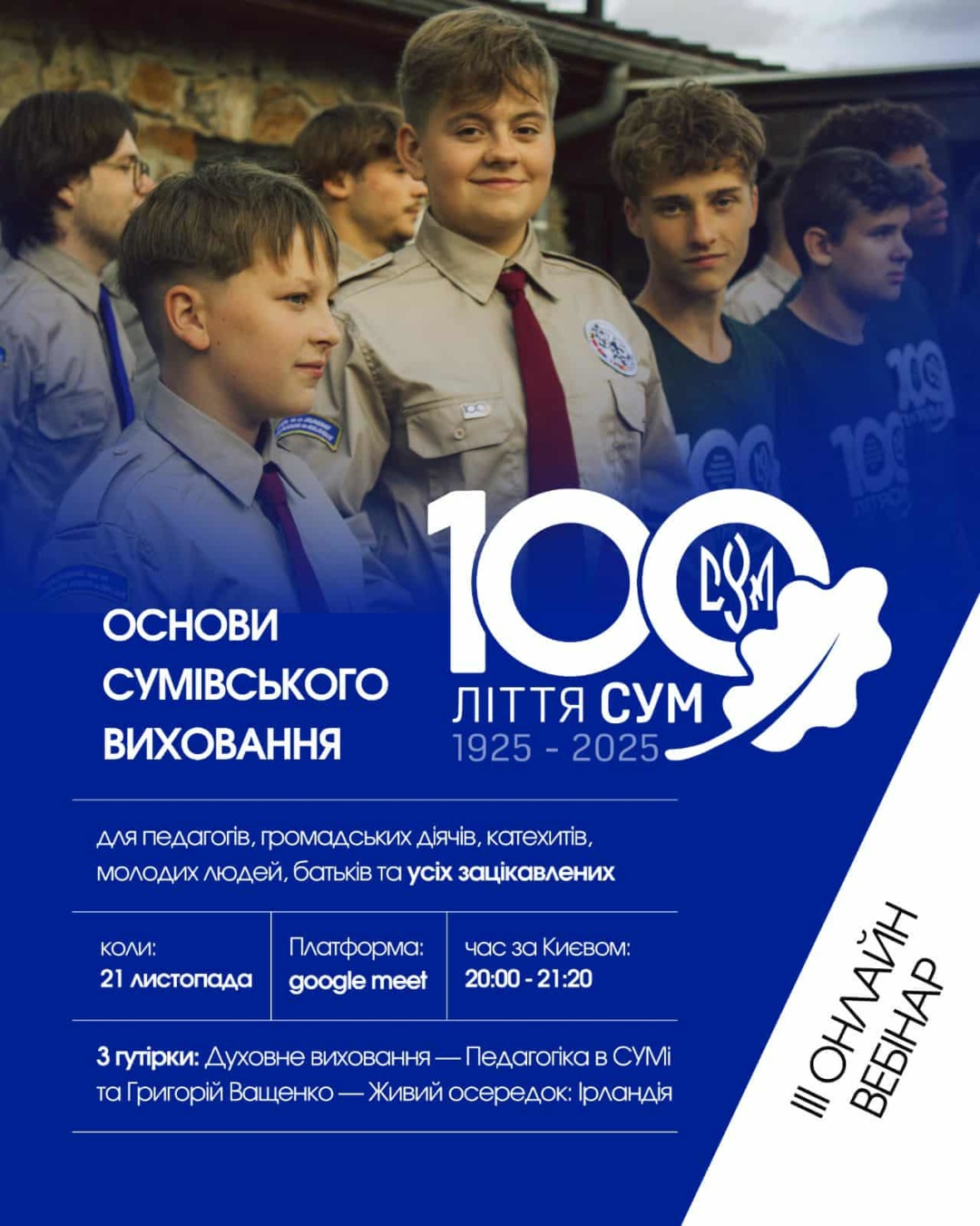 Ця зустріч буде зосереджена на двох ключових напрямках: духовності та педагогіці. У програмі вебінару (тривалість 1 год 20 хв) заплановано три тематичні модулі: духовне виховання, педагогіка в СУМі та ідеї Г. Ващенка, живий осередок – Ірландія.