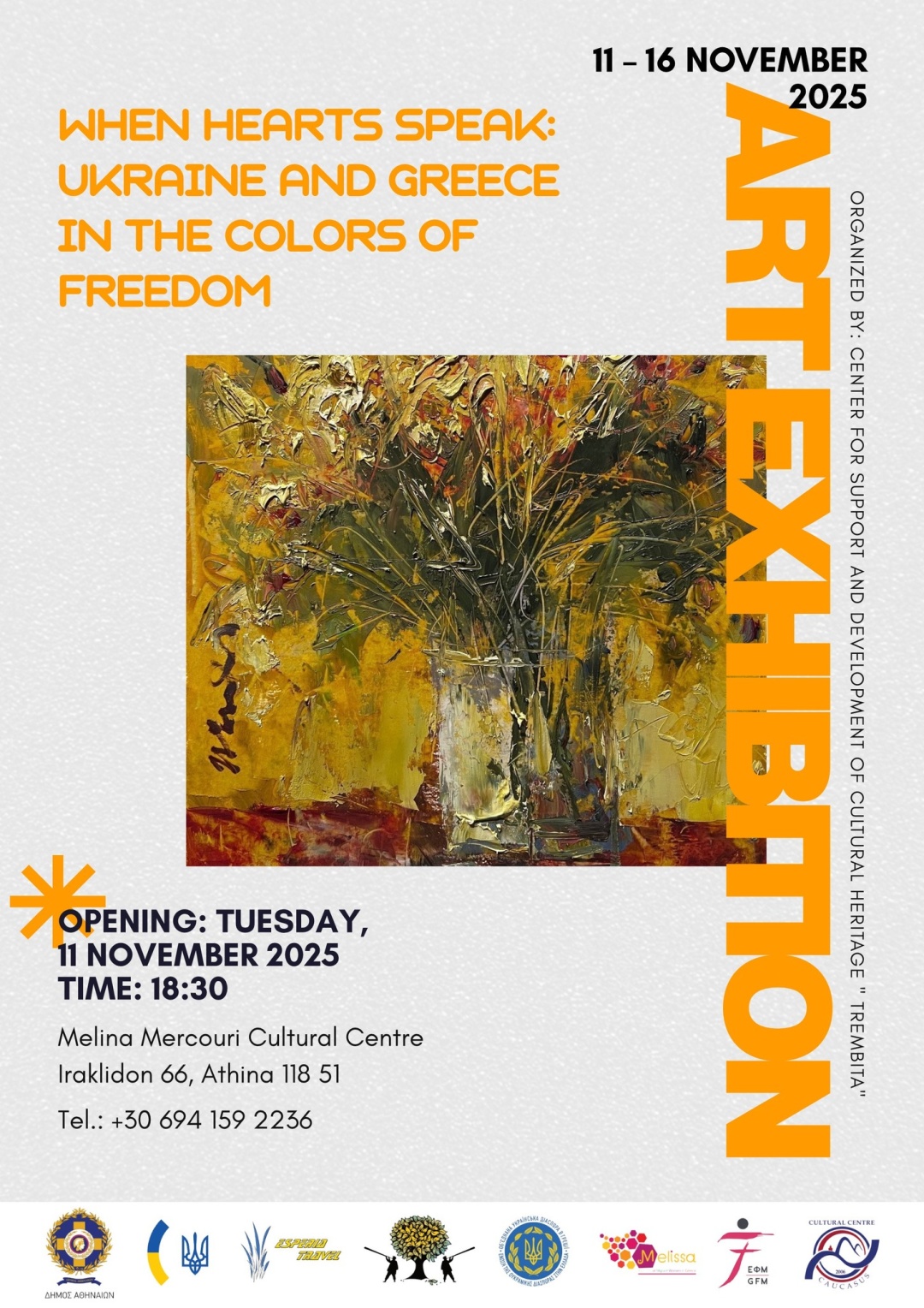 Виставка проходить під егідою посольства України в Грецькій Республіці та представляє сучасне українське та грецьке мистецтво.