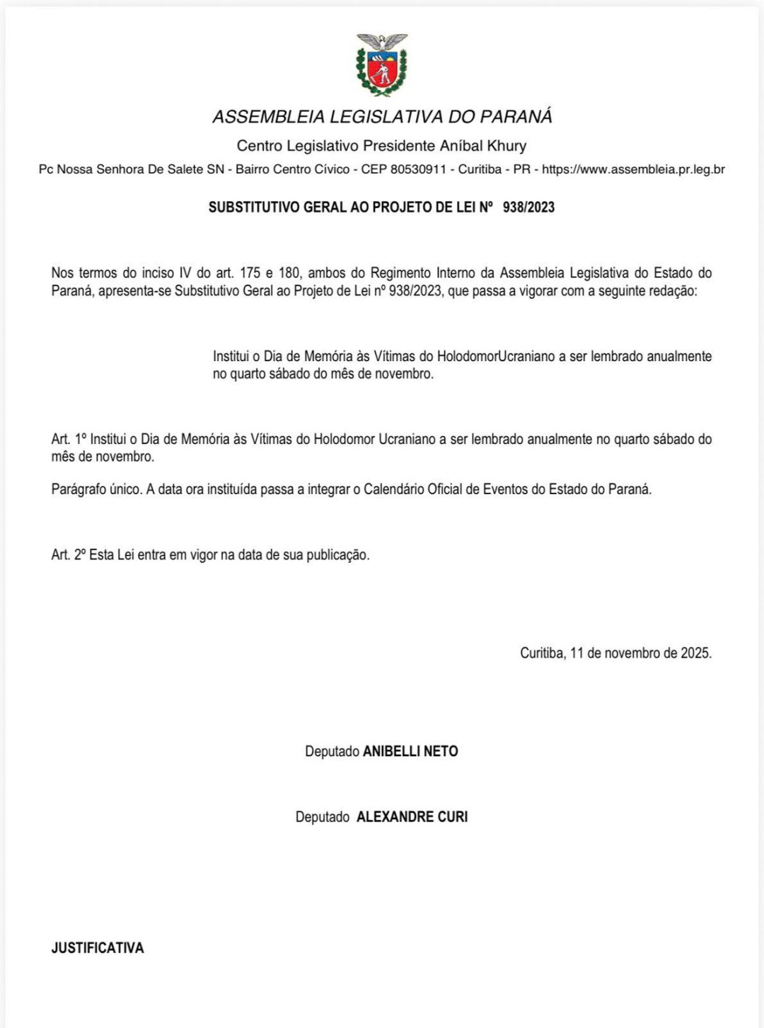 На знак вшанування пам'яті жертв трагедії, президенту Законодавчих зборів штату Парана Александру Курі передали книгу відомого дослідника Володимира Сергійчука «Голодомор 1932-1933».
