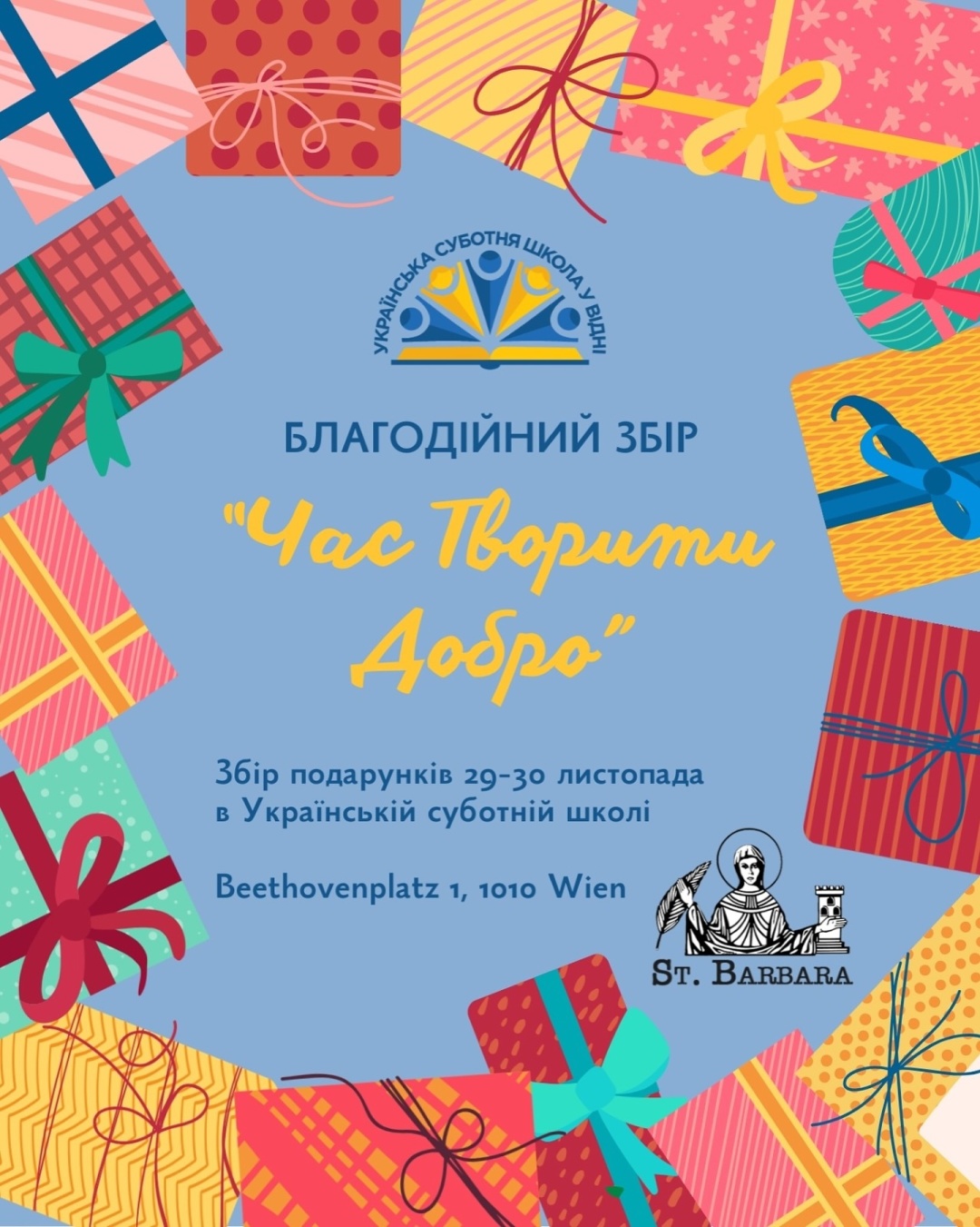 Акція зі збору подарунків відбудеться 29–30 листопада за адресою: Українська суботня школа у Відні, Beethovenplatz 1, 1010 Wien.
