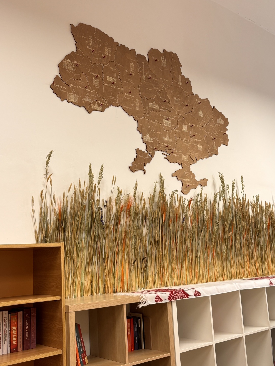 В Українському куточку представлені: книги з української літератури та історії, традиційні українські візерунки та лементи національної тематики.