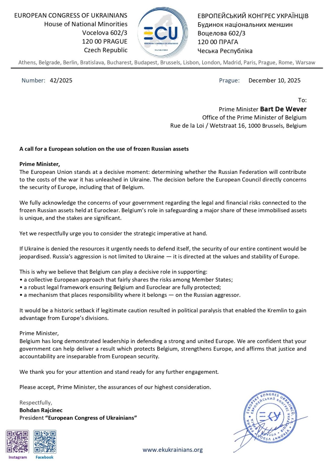 «Пане прем’єр-міністре, Бельгія вже давно демонструє лідерство у захисті сильної та єдиної Європи. Ми впевнені, що ваш уряд може допомогти досягти результату, який захистить Бельгію, зміцнить Європу та підтвердить, що справедливість і відповідальність є невід'ємними складовими європейської безпеки», - йдеться у листі.