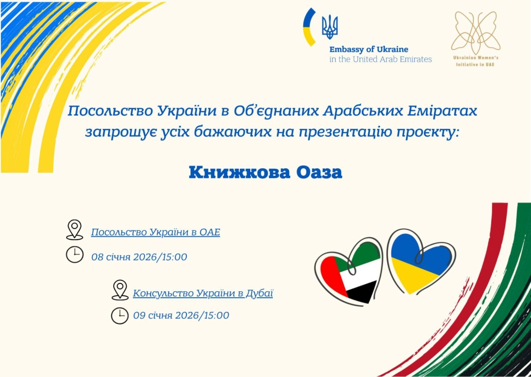 Марафон заходів відкриває культурна ініціатива «Книжкова оаза», організована посольством та консульством України в Дубаї у партнерстві з Українською жіночою ініціативою в ОАЕ.