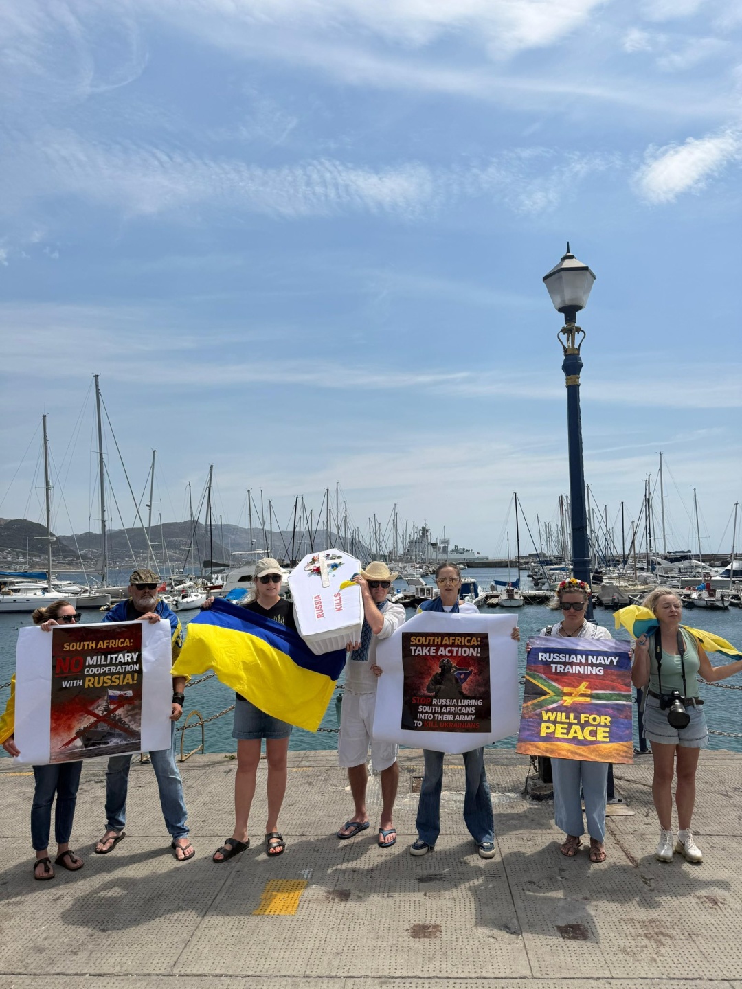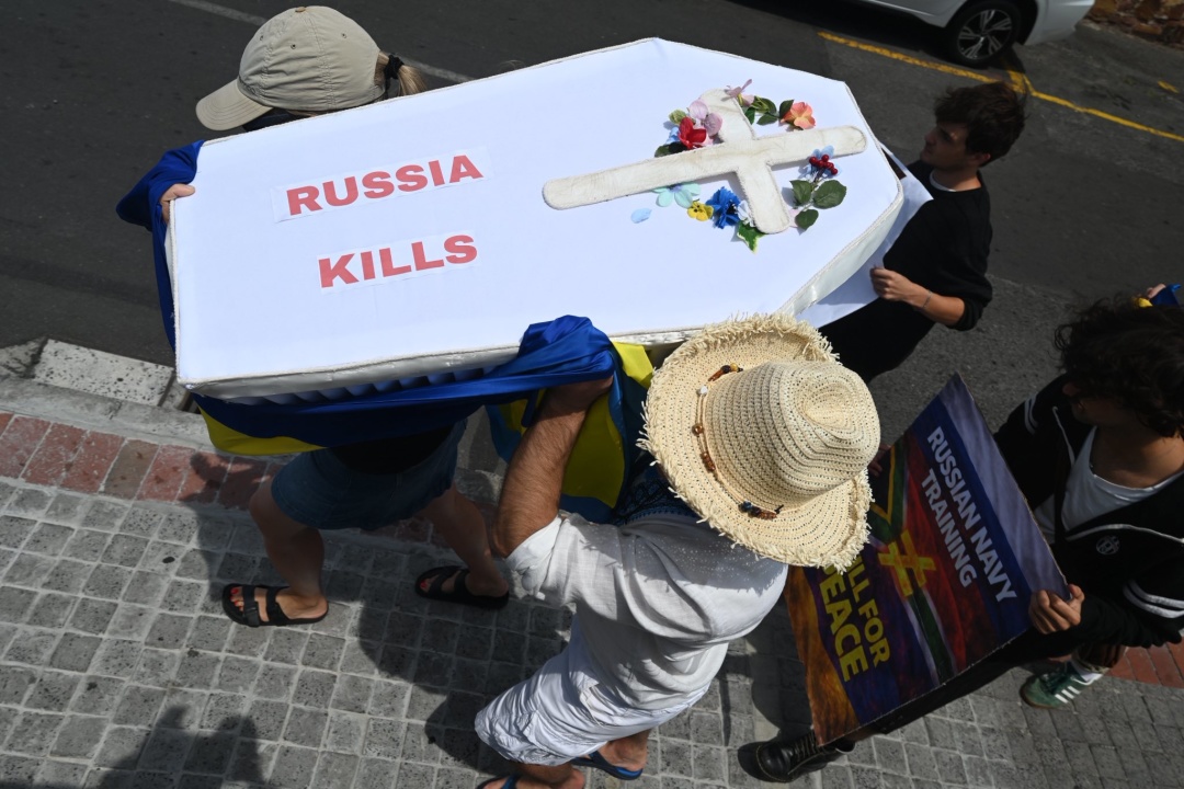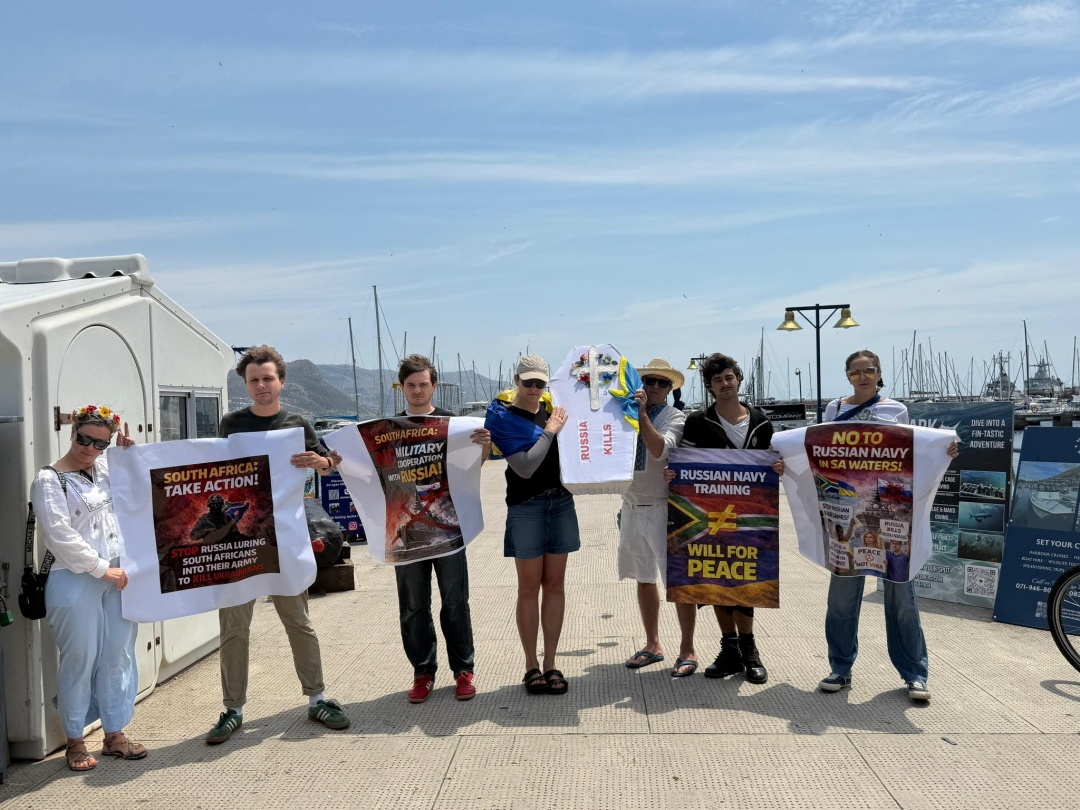 «Ми тут, щоб представляти убитих українських дітей. Російський військовий корабель не може курсувати південноафриканськими водами так, ніби нічого не відбувається», – заявила представниця асоціації Ольга.