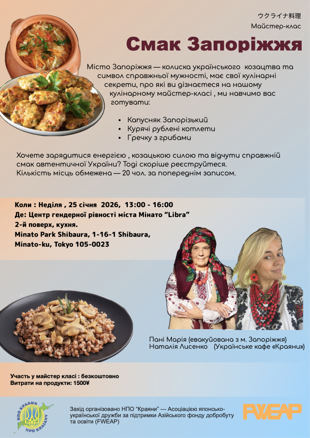 Майстер-клас відбудеться у неділю, 25 січня, з 13:00 до 16:00 у Центрі гендерної рівності міста Мінато Libra, 2-й поверх, кухня (Minato Park Shibaura, 1-16-1 Shibaura, Minato-ku, Tokyo 105-0023).