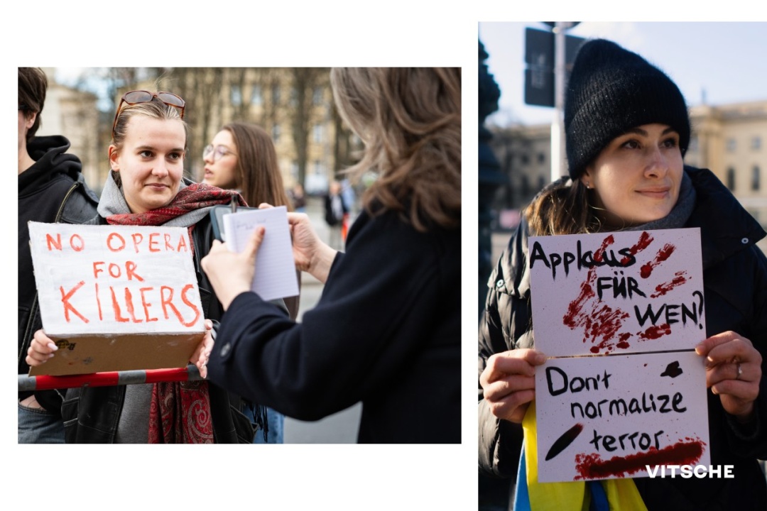 Протестувальники нагадали відвідувачам опери про реальні наслідки російської політики, яку нормалізують такі артисти: зруйновані міста, знищену українську культуру та депортацію дітей.