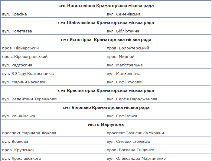В Краматорську вул. Блюхера перейменовано у вул. Горіхова, вул. Анрі Барбюса – у вул. Пантелеймона Куліша, вул. Дем’яна Бєдного у вул. Пилипа Орлика, а вул. 26 Бакінських Комісарів стала вул. Червона Рута.
