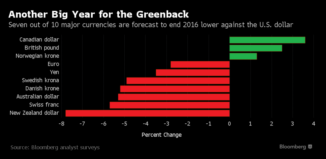 Bloomberg прогнозує, що в 2016 році курс долара підніметься на три відсотки по відношенню до євро, на 2,5 відсотка по відношенню до ієни і майже на шість відсотків по відношенню до швейцарського франка. При цьому курс американської валюти знизиться по відношенню до канадського долара, британського фунта стерлінгів і норвезької крони.