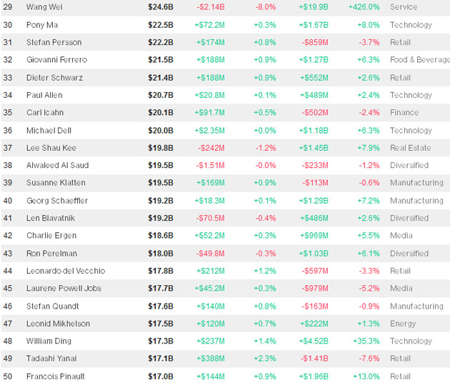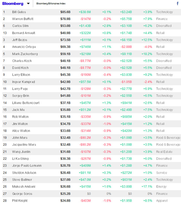 У трійці лідерів - засновник компанії Microsoft Білл Гейтс зі статком у 85,6 млрд доларів, інвестор Воррен Баффет з 78,9 млрд і телекомунікаційний магнат Карлос Слім, чий статок оцінюється в 53 млрд доларів.