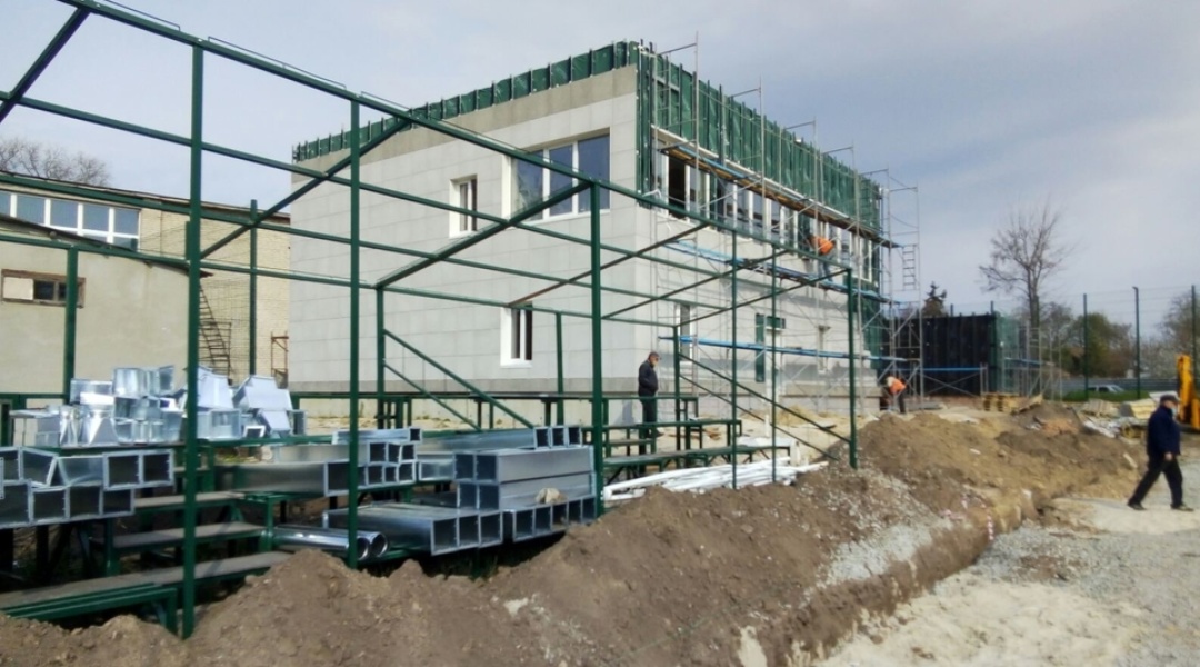 Будівельники вже звели двоповерхову адміністративну будівлю, де будуть тренерські, роздягальні, душові. Облаштували покрівлю, вікна та двері, завершують утеплювати фасад.