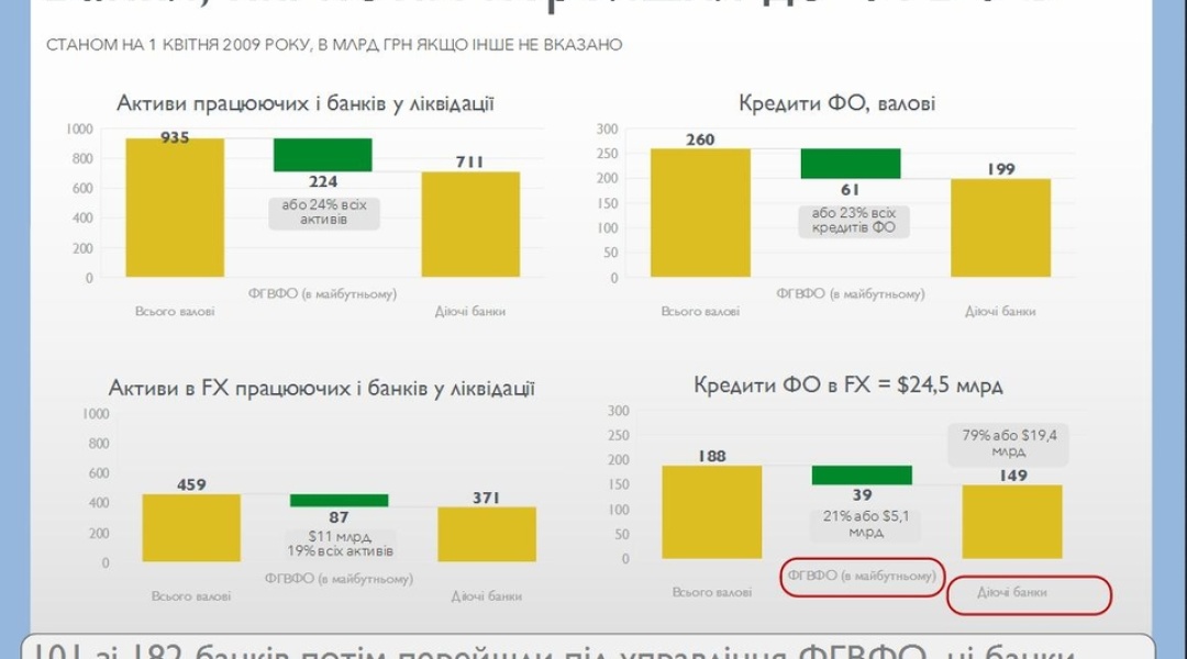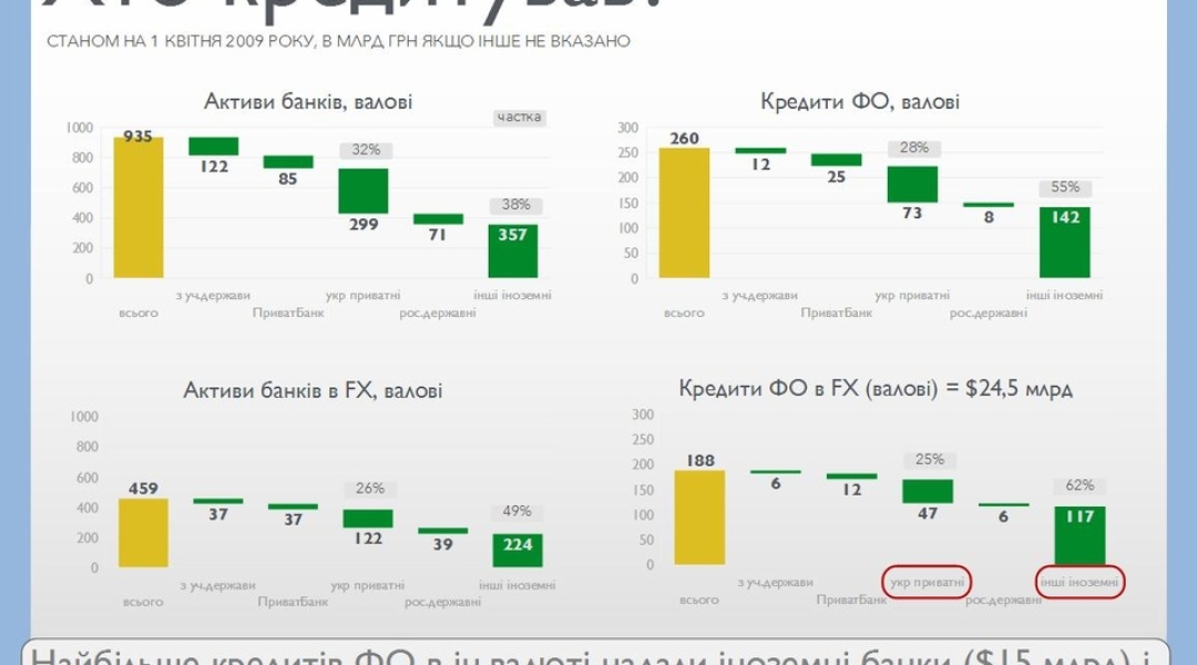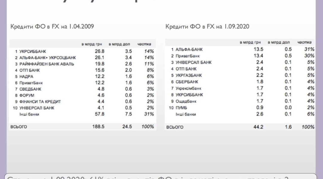 За даними НБУ, обсяги проблемних кредитів в іноземній валюті станом на 1 вересня минулого року перевищили 44 млрд грн. Причому понад 60% таких кредитів (приблизно порівну) сконцентрували Альфа-банк і ПриватБанк. Докладніше – у презентації, яку Укрінформу надала експертка з фінансів, ексконсультантка Світового банку Анна Муріна, яка багато років вивчає “кредитне питання”.