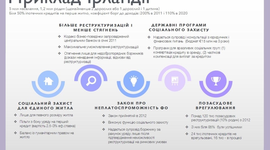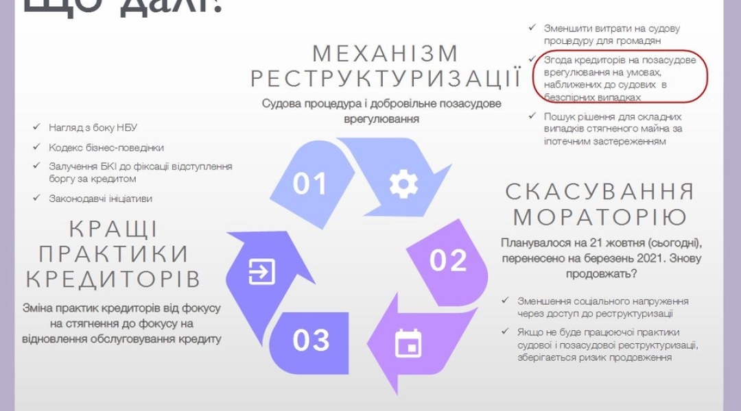 “По-перше, механізм реструктуризації боргу фізичної особи, що виник за кредитом в іноземній валюті, який забезпечений іпотекою квартири або житлового будинку, що є єдиним місцем проживання сім'ї боржника, визначений Кодексом України з процедур банкрутства, введеним у дію в жовтні 2019 року. Він передбачає, що протягом 5 років – до 21 жовтня 2024 року – іпотечні кредити в іноземній валюті можуть бути реструктуризовані за процедурою неплатоспроможності фізичної особи, передбаченою Кодексом. У ході реструктуризації арбітром між боржником та кредитором є суд, який може оцінити обставини справи і становище позичальника. Такий підхід надає можливість здійснити реструктуризацію заборгованості на справедливих і збалансованих умовах”, – йдеться в коментарі НБУ.