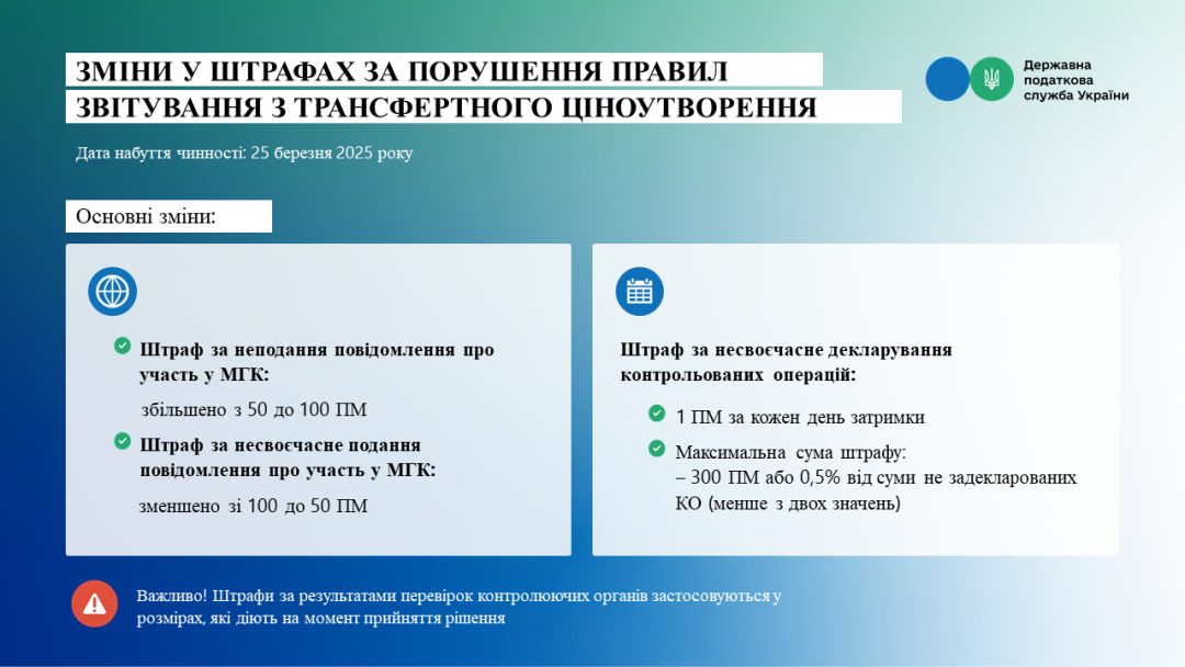 У ДПС зазначили, що штраф за неподання повідомлення про участь у міжнародній групі компаній збільшено вдвічі - зі 50 до 100 прожиткових мінімумів для працездатної особи. Водночас штраф за несвоєчасне подання такого повідомлення зменшено зі 100 до 50 прожиткових мінімумів.