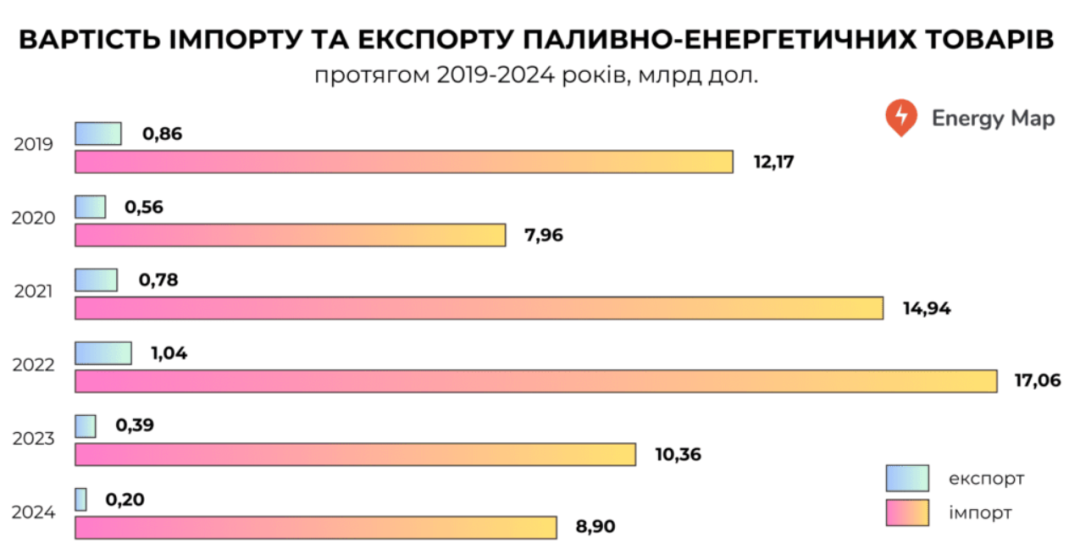 "Протягом 2024 року Україна імпортувала паливно-енергетичних товарів на суму 8,9 млрд дол., що на 1,47 млрд дол. або на 14,2% менше ніж за 2023 рік. Надходження від експорту зменшилися майже вдвічі – з 0,39 млрд дол. до 0,2 млрд дол.", - йдеться у повідомленні.